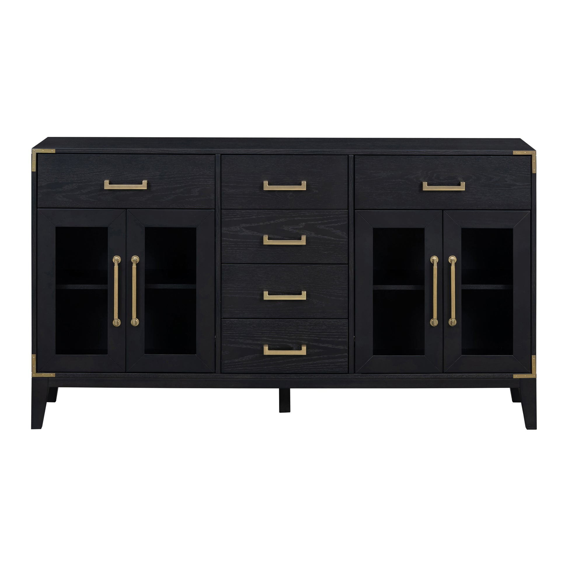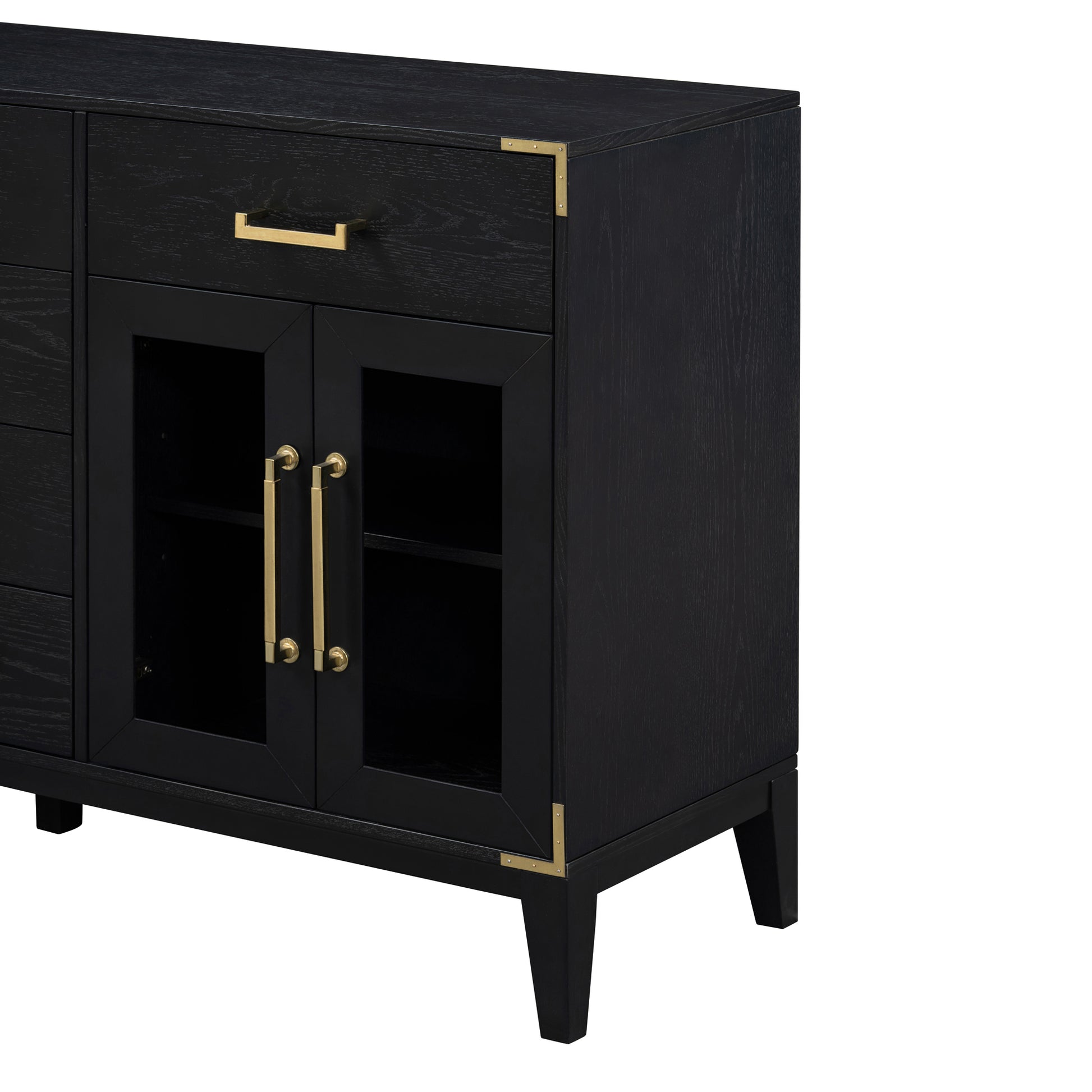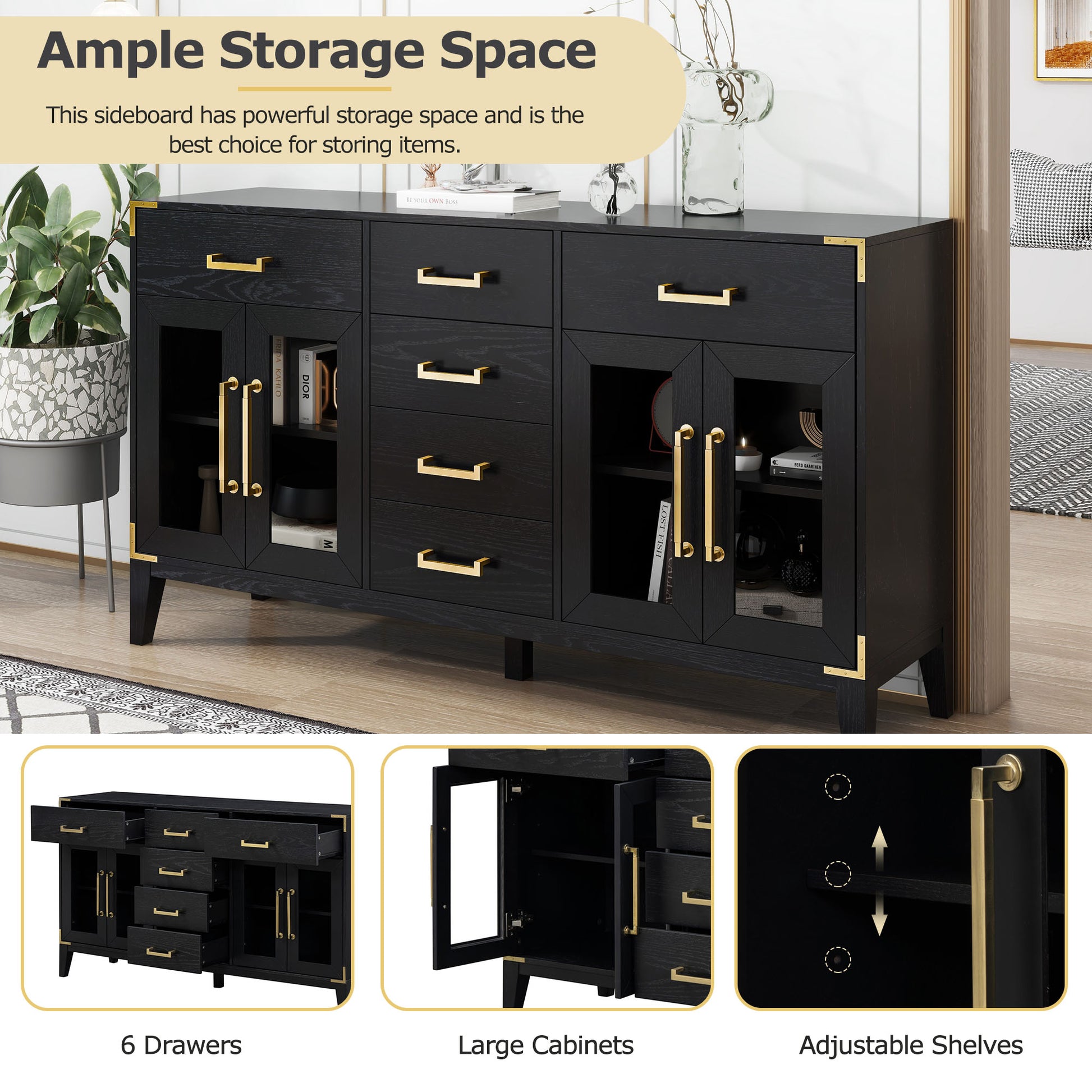6 Drawer And 2 Cabinet Retro Sideboard With Extra Large Storage Space, With Gold Handles And Solid Wood Legs, For Kitchen And Living Room Black Black Solid Wood Mdf