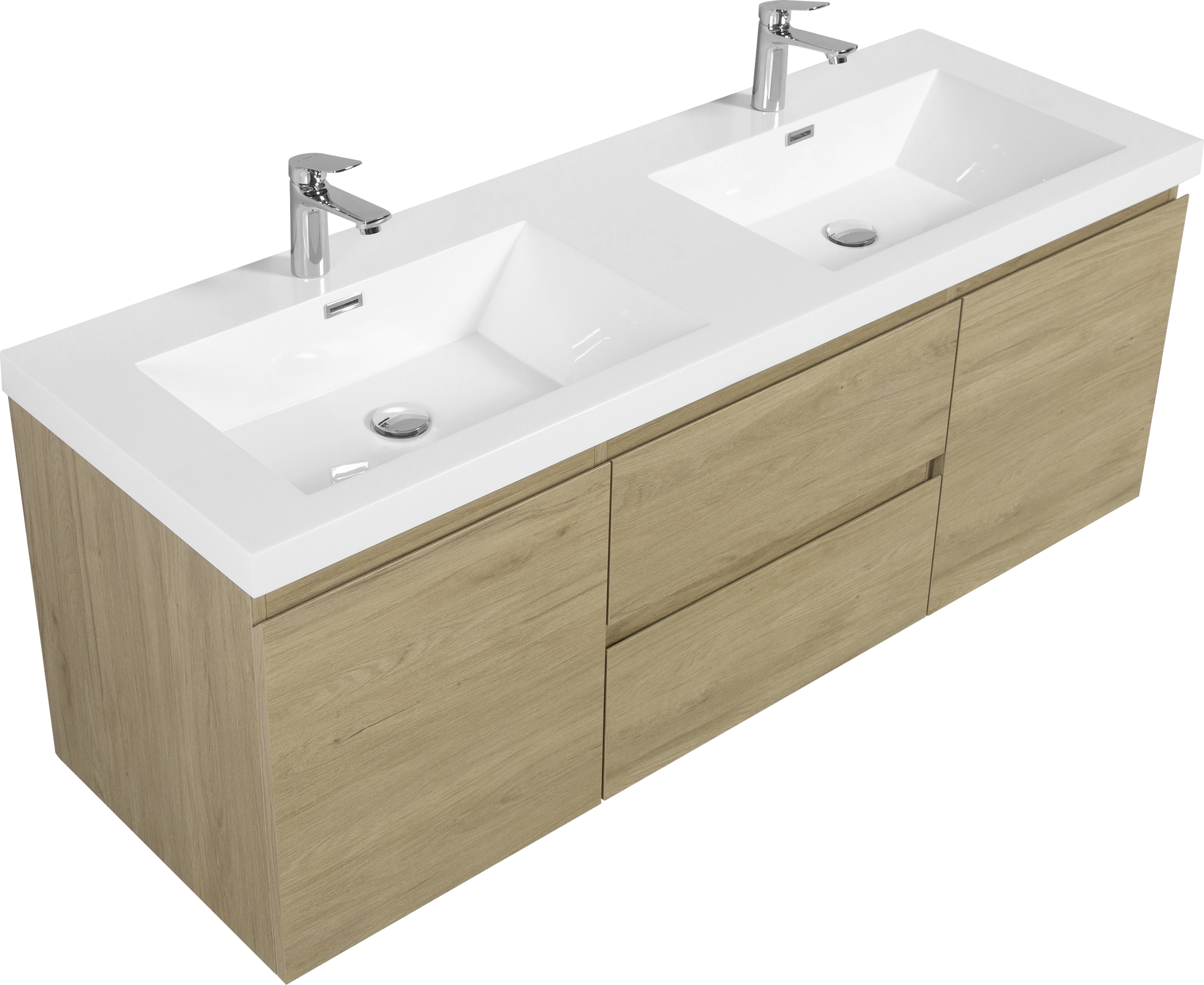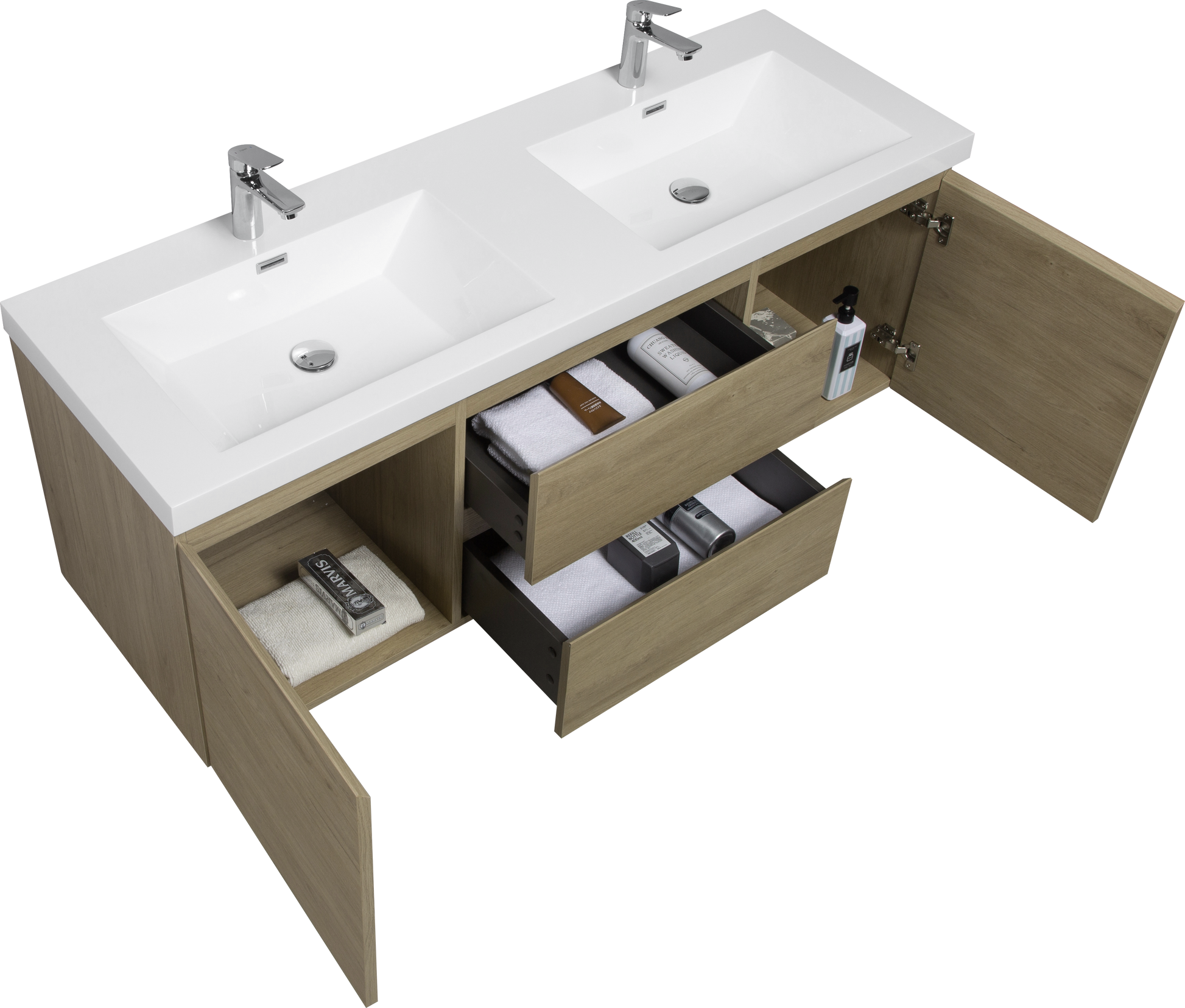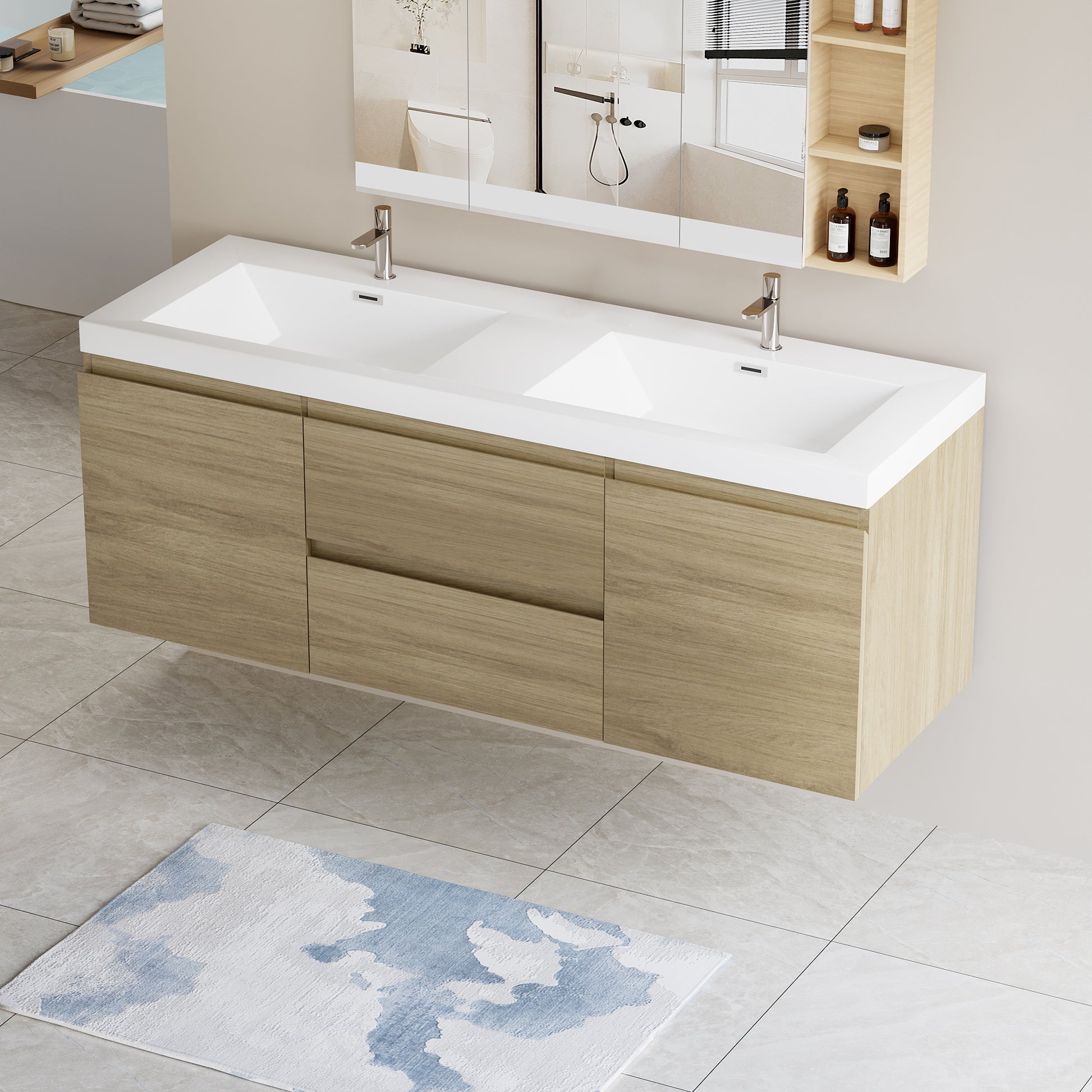 60" Floating Bathroom Vanity With Sink, Modern Wall Mounted Bathroom Storage Vanity Cabinet With Double Resin Top Basins And Soft Close Drawers, Natural Oak 24V11 60Dno 2 Oak 2 Bathroom Wall Mounted