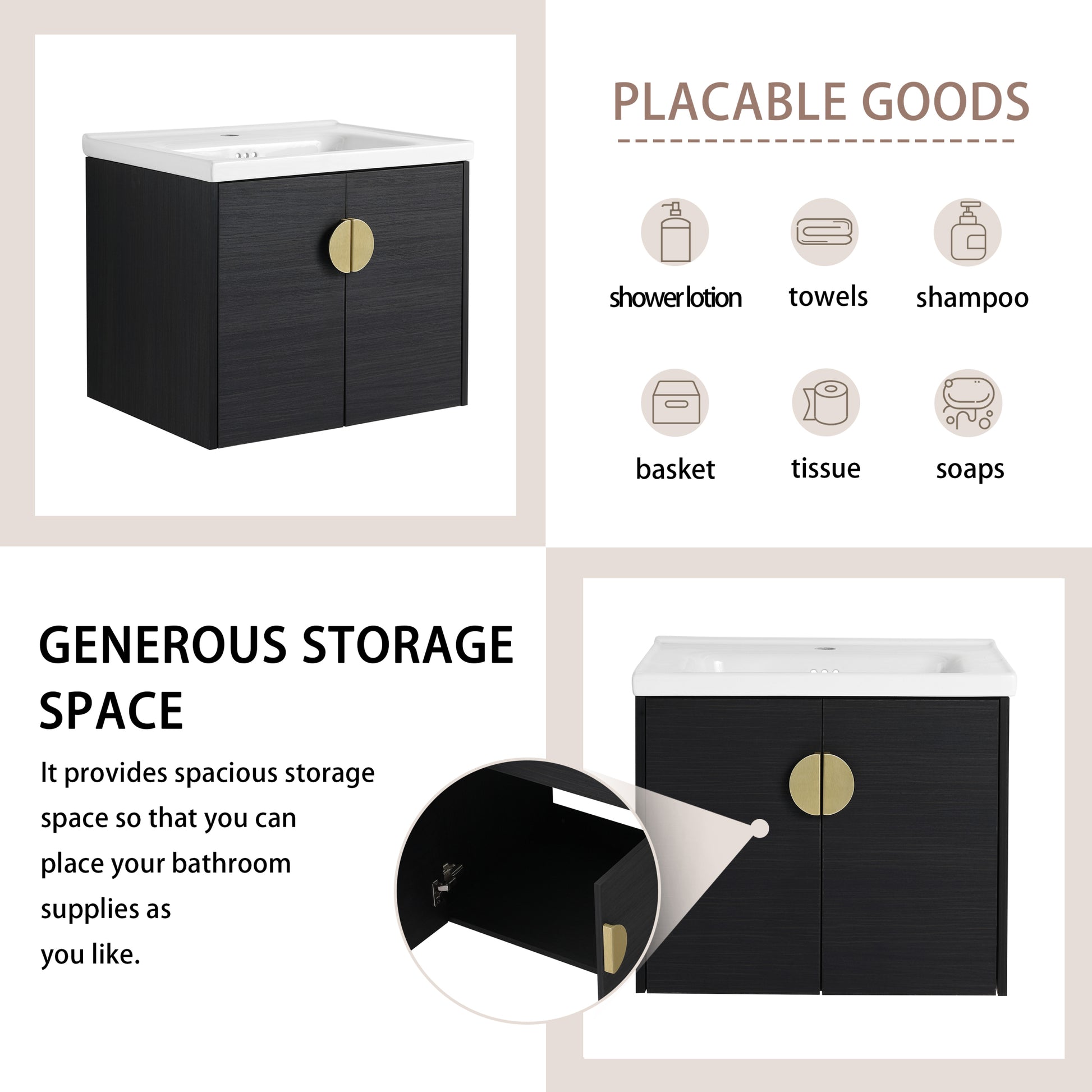 | Package includes | - 2x Vanity Cabinets; - 1x Small Storage Shelves; - 2x Ceramic Basin; -4x Metal Handle |