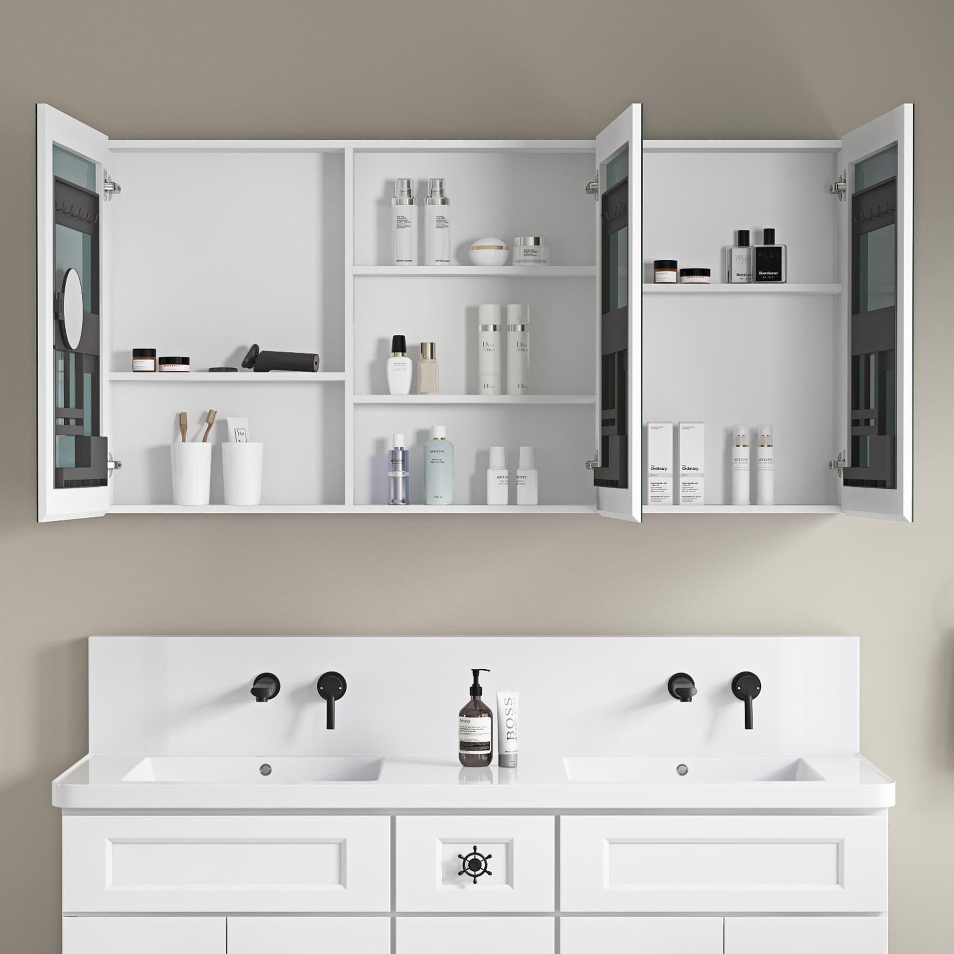 60'' W X 30'' H Bathroom Mirror Medicine Cabinet Wooden Door Medicine Cabinets For Bathroom, Wall Mounted Recessed Or Surface, Bathroom Mirror With Storage White Engineered Wood