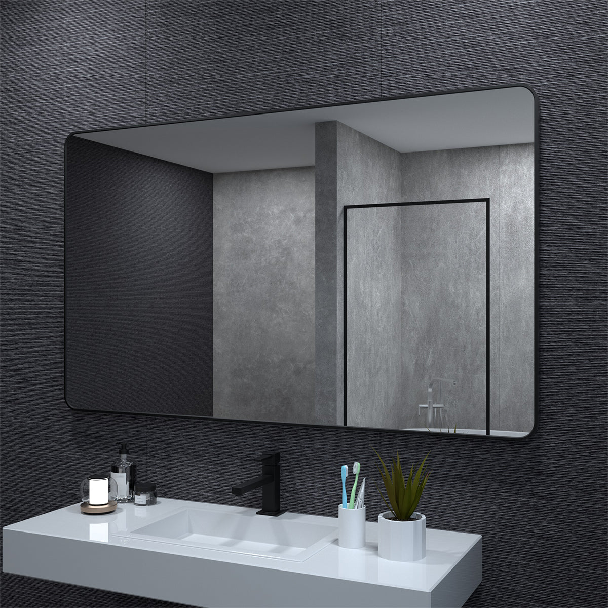 60X36 In. Aluminum Framed Rounded Rectangle Bathroom Wall Mirror, Matte Black Bathroom Vanity Mirror Farmhouse, Anti Rust, Tempered Glass Mirrors, Hangs Horizontally Or Vertiy Matte Black Aluminum