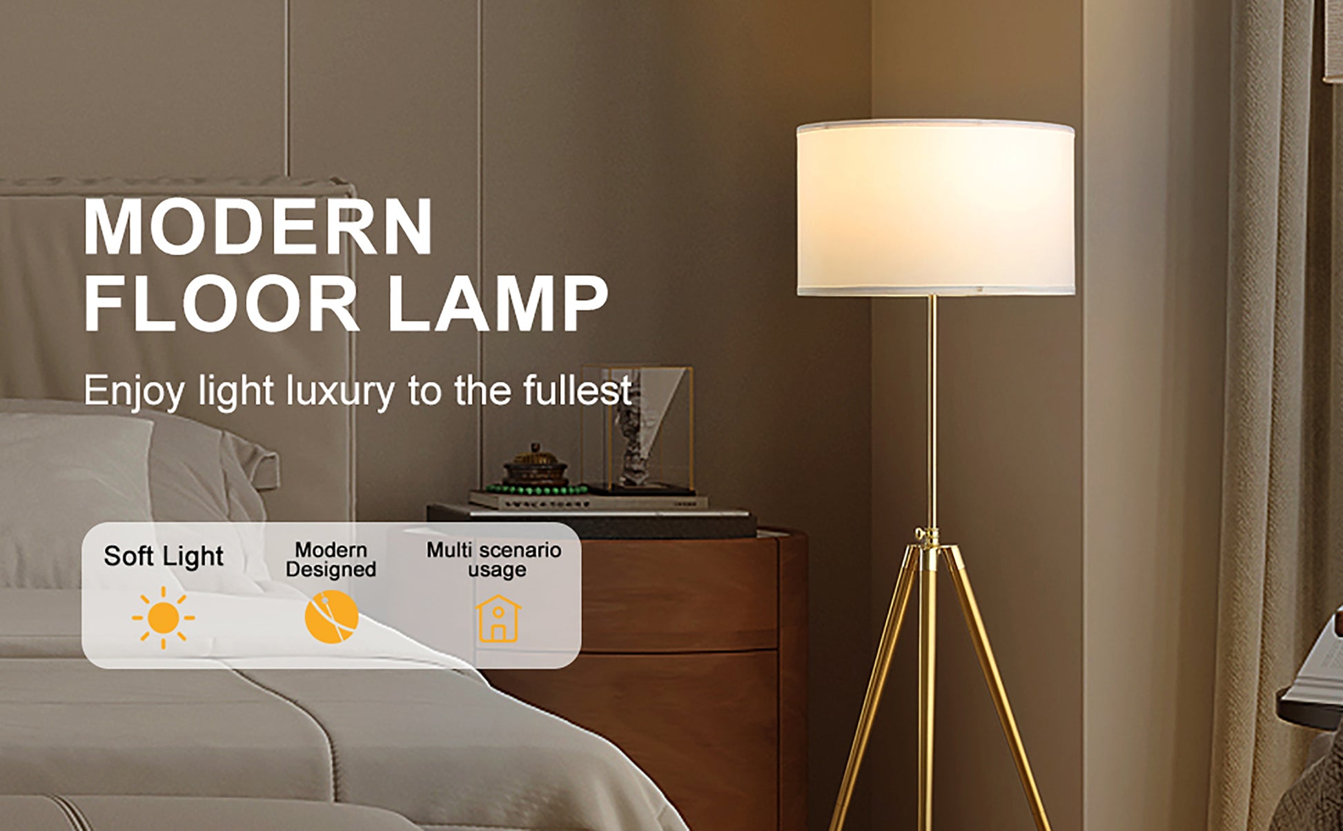 64" 47"H Adjustable Height Brass Shiny Gold Modern Tripod Floor Lamp For Living Room, Standing Lamp For Bedroom Gold White Fabric Metal