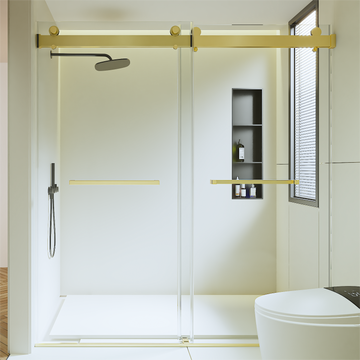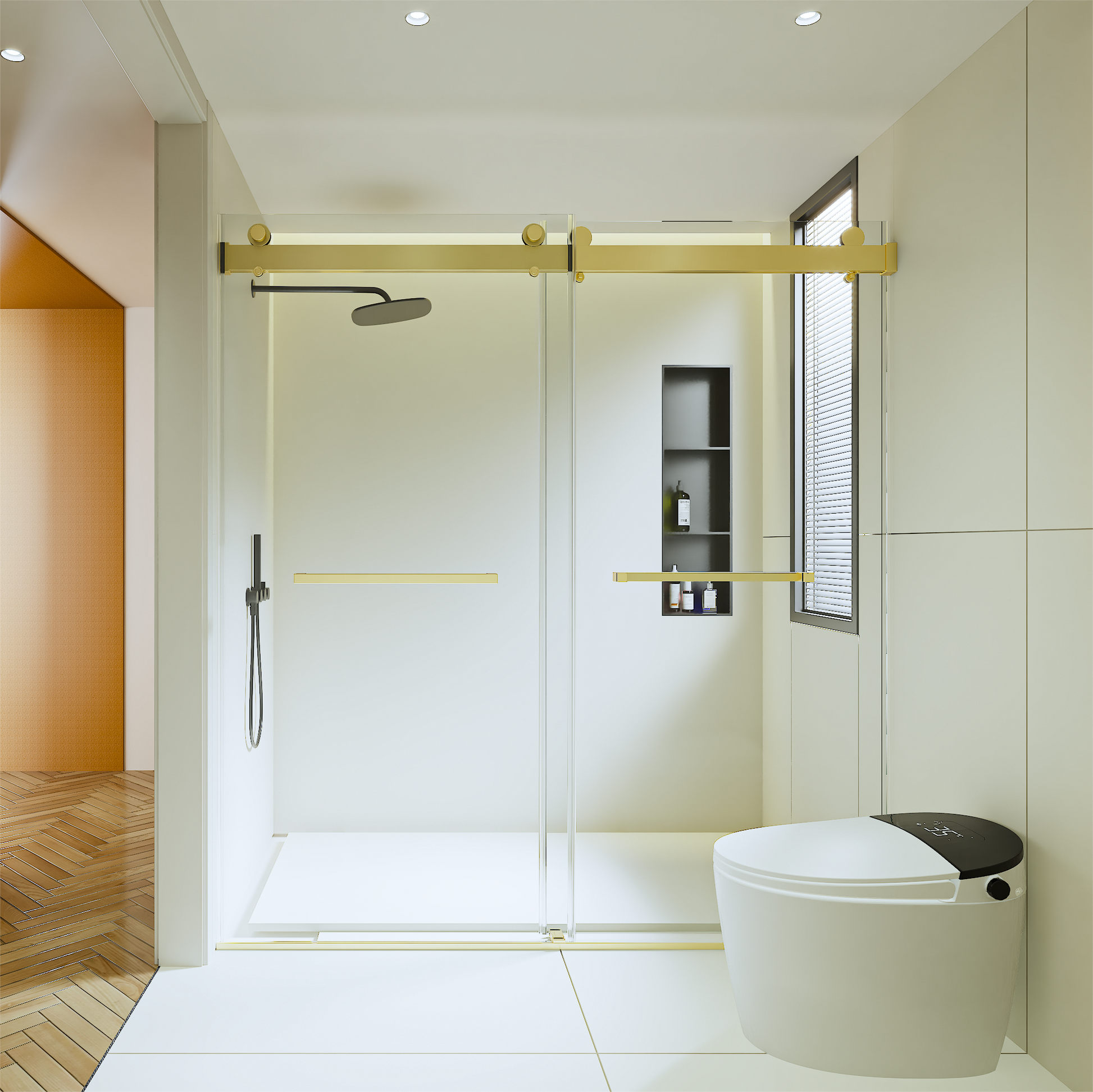 68 72 Inches *76 Inches Frameless Double Sliding Soft Close Shower Door, 3 8 Inches 10Mm Thick Sgcc Tempered Glass Door, Brushed Gold Brushed Gold Glass Metal