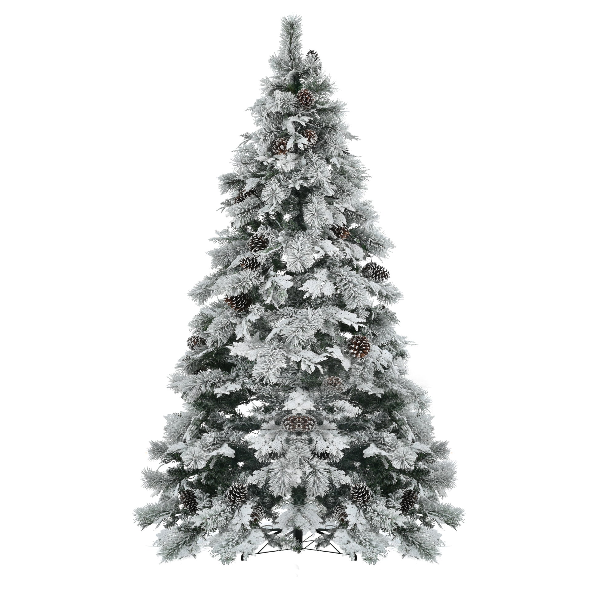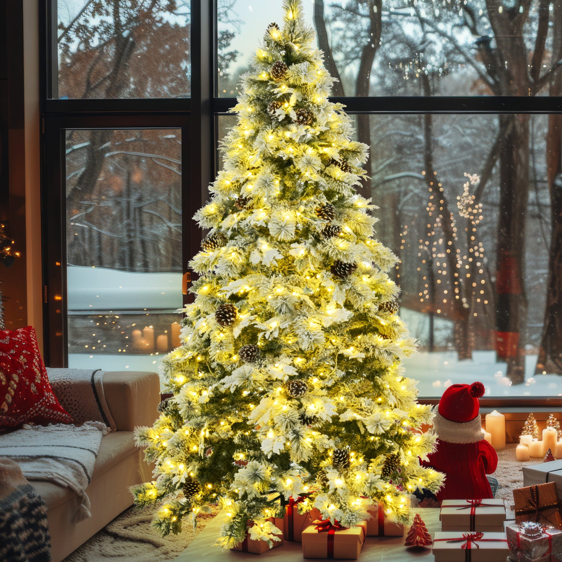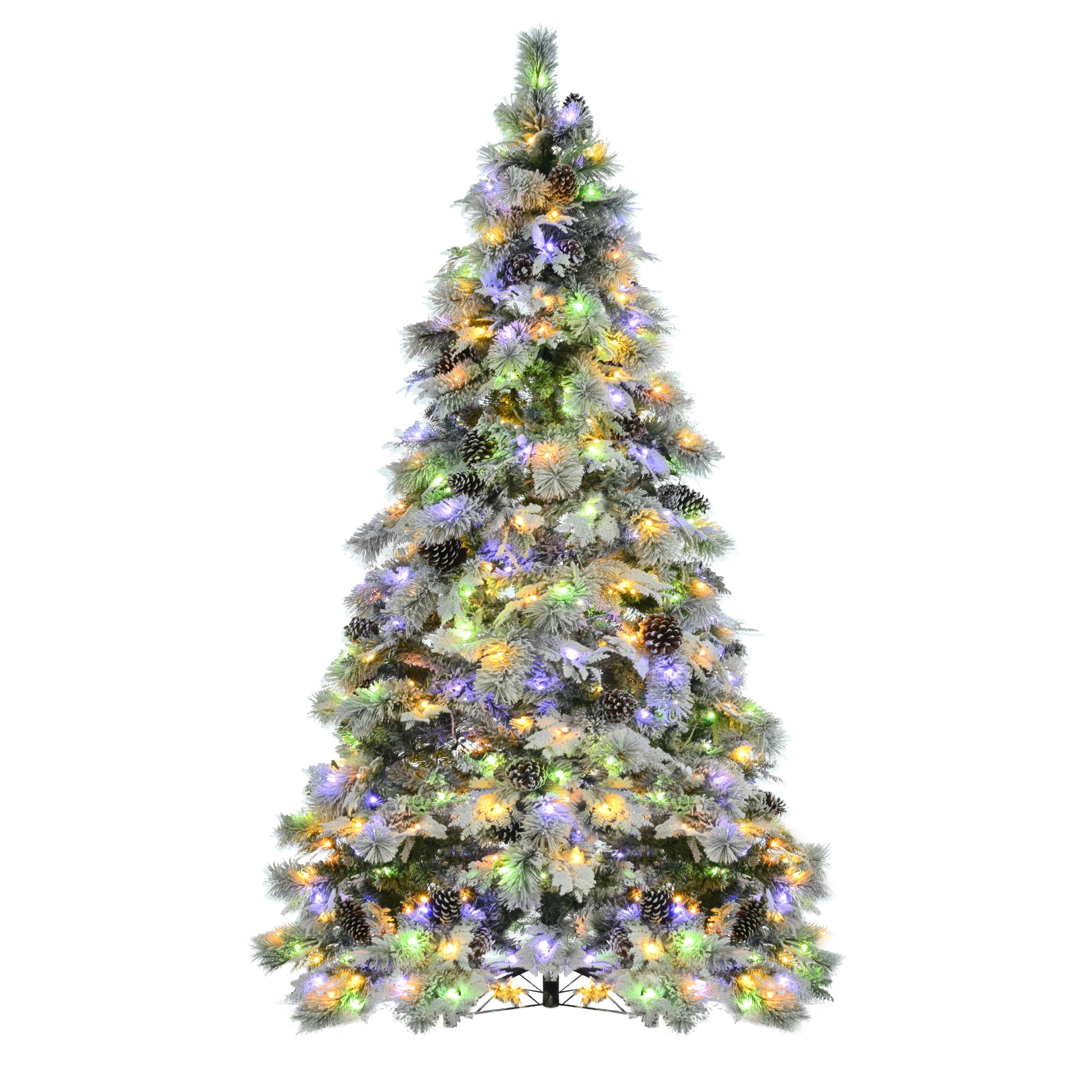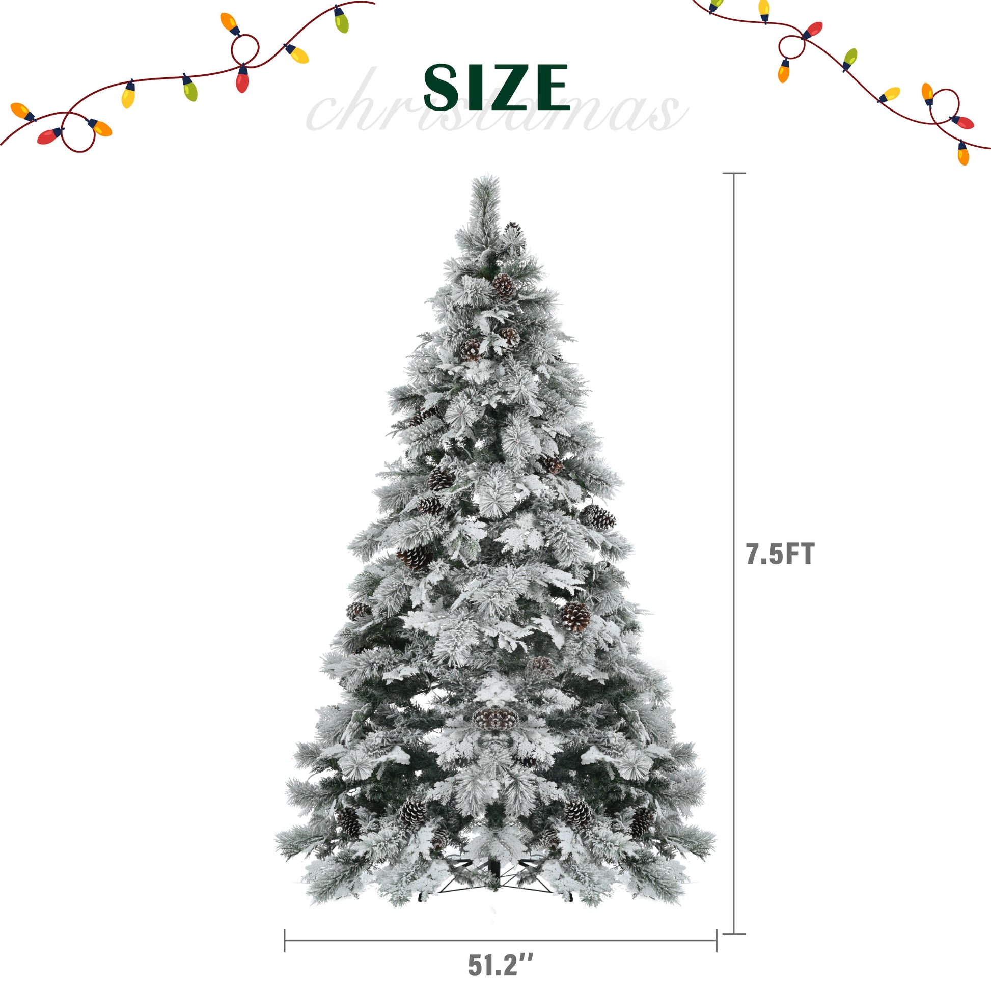 7.5Ft Pre Lit Spruce Snow Flocked Christmas Tree With Pine Cones, Artificial Xmas Tree With 745 Branch Tips,Mixed Pe & Pvc Branches, 450 Multi Color Led Lights, 11 Flashing Modes, Holiday Decor White Green Polyethylene,Pvc
