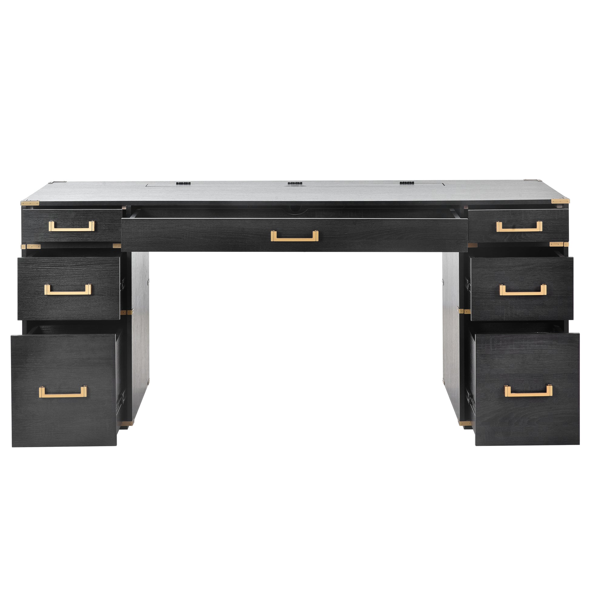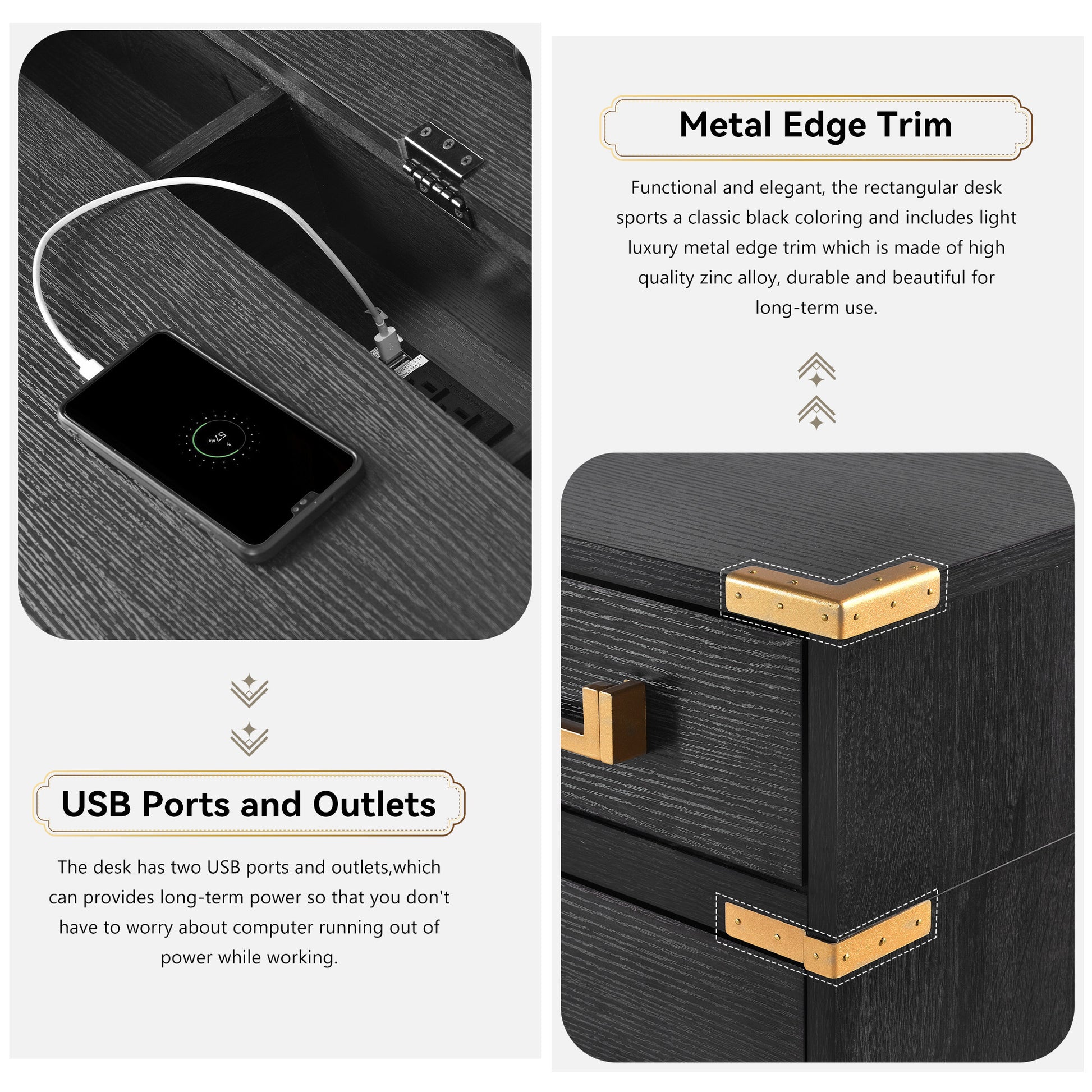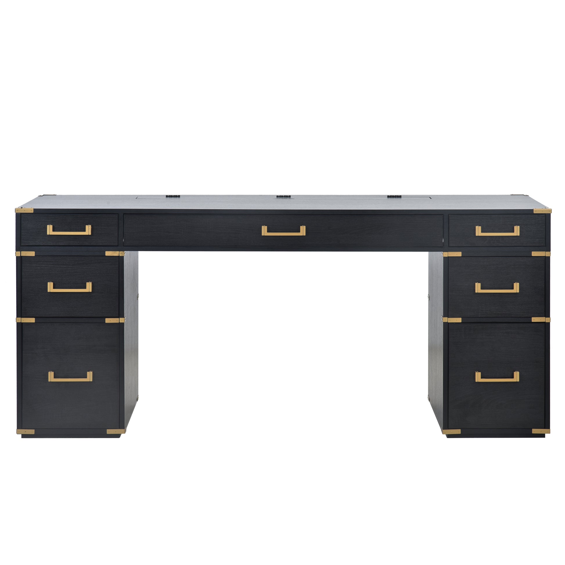 70"Classic And Traditional Executive Desk With Metal Edge Trim ,Writing Desk With 2 File Drawers,Usb Ports And Outlets,Desk With Hidden Compartment For Living Room,Home Office,Study Room,Black Black Gold Mdf Metal