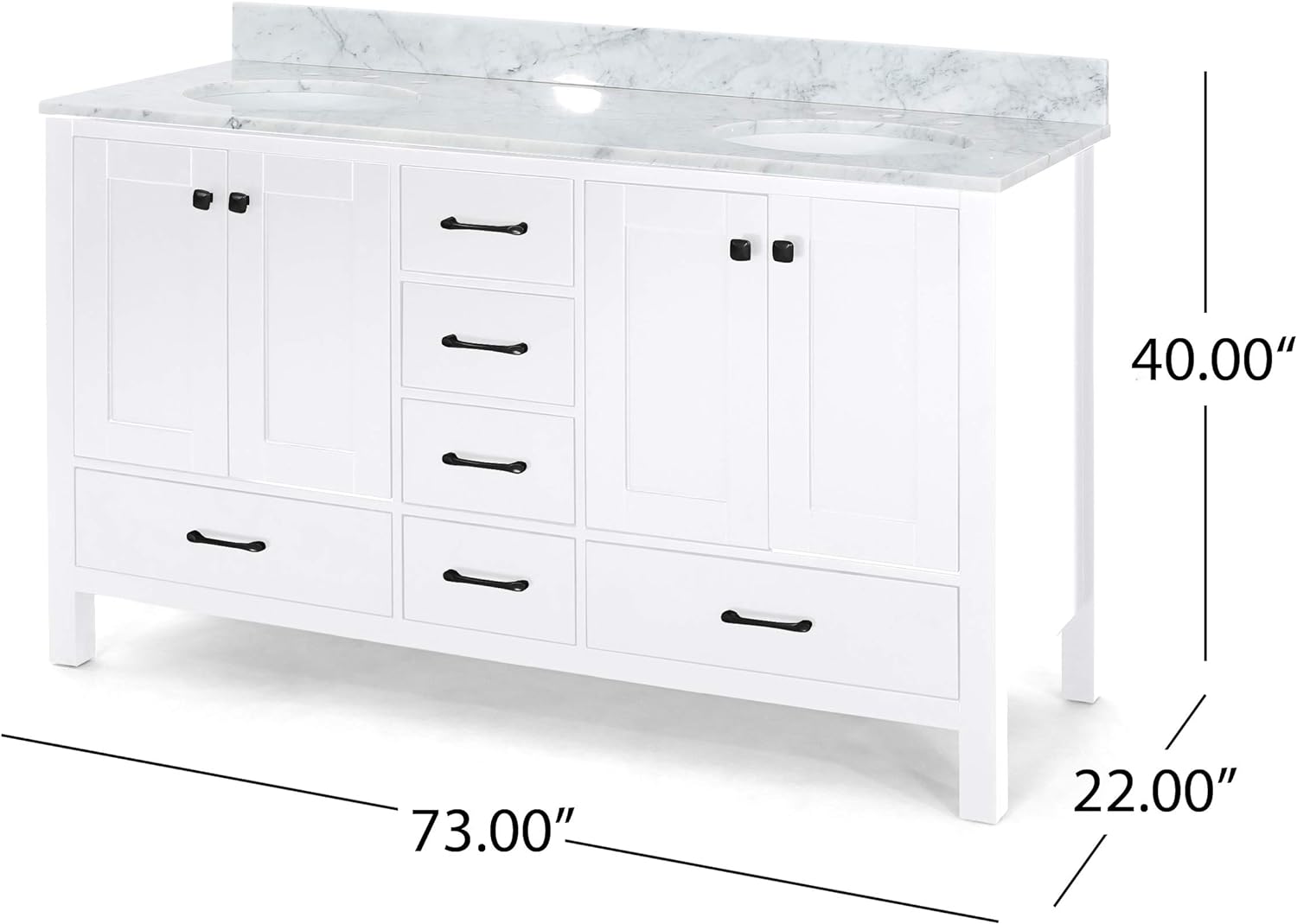 73'' Bathroom Vanity With Marble Top & Double Ceramic Sinks, 4 Doors, 6 Drawers, White White Plywood