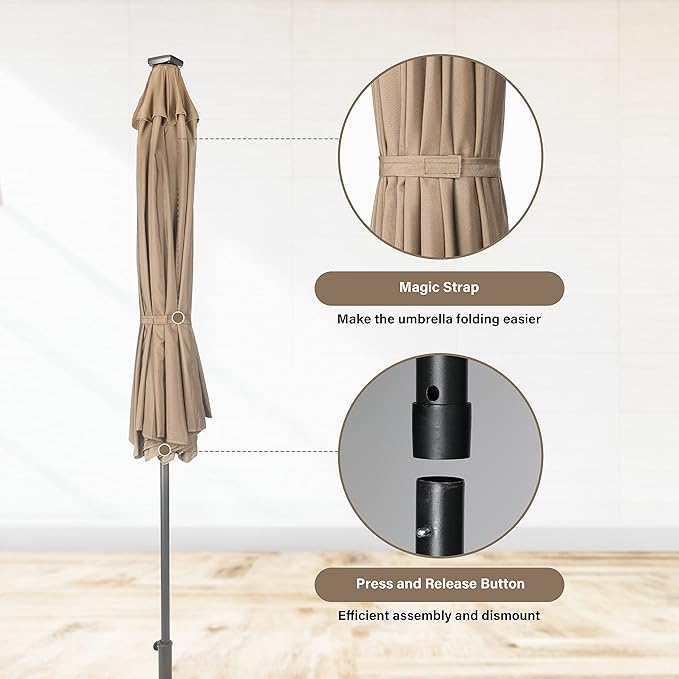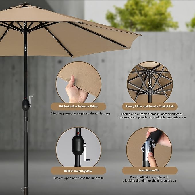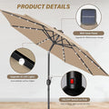9' Solar 32 Lighted Patio Table Market Push Button Tilt Crank Outdoor Umbrella For Garden,Deck,Backyard And Pool,9Ft Led,Tanled Tan Stainless Steel