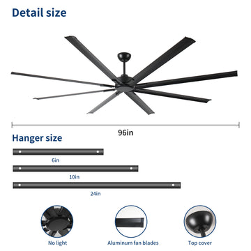 96 Inch Industrial Dc Motor Ceiling Fan, Large Ceiling Fan With 8 Reversible Blades, 5 Speed Remote Control, Home Or Commercial Ceiling Fans For Porch Garage Shop, Black Black Aluminium