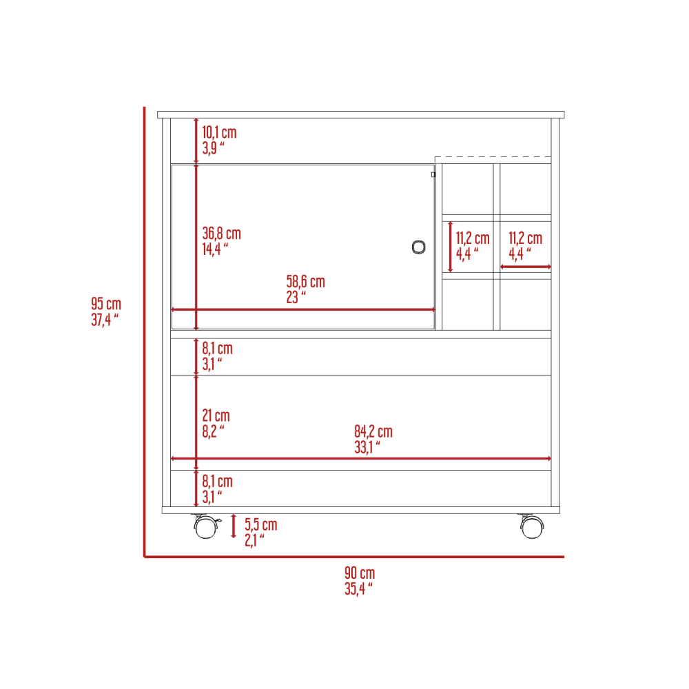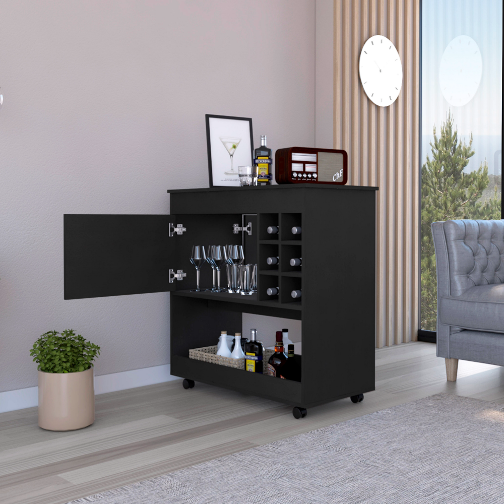 Bar Cart Aloha, Lower Panel, Six Bottle Cubbies, One Cabinet, Black Wengue Finish Black Particle Board
