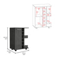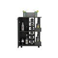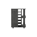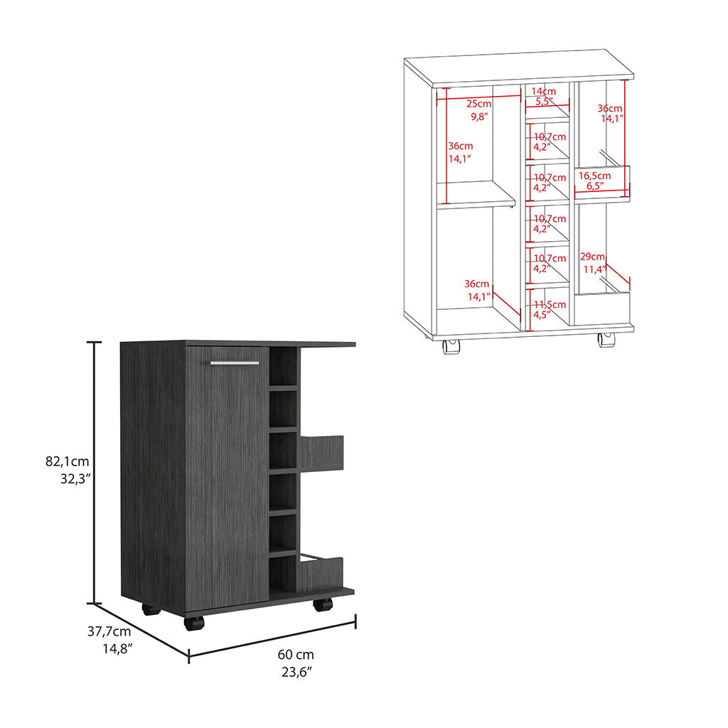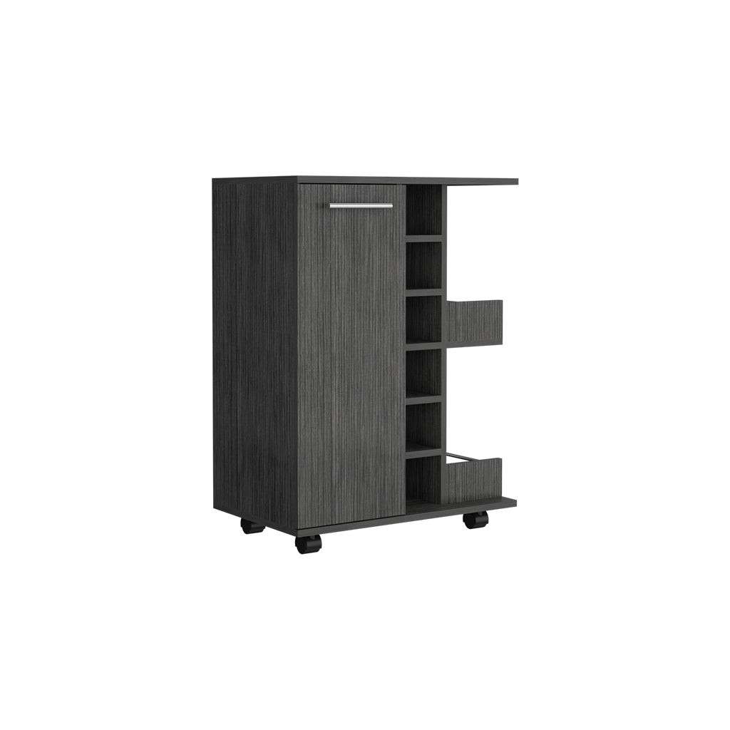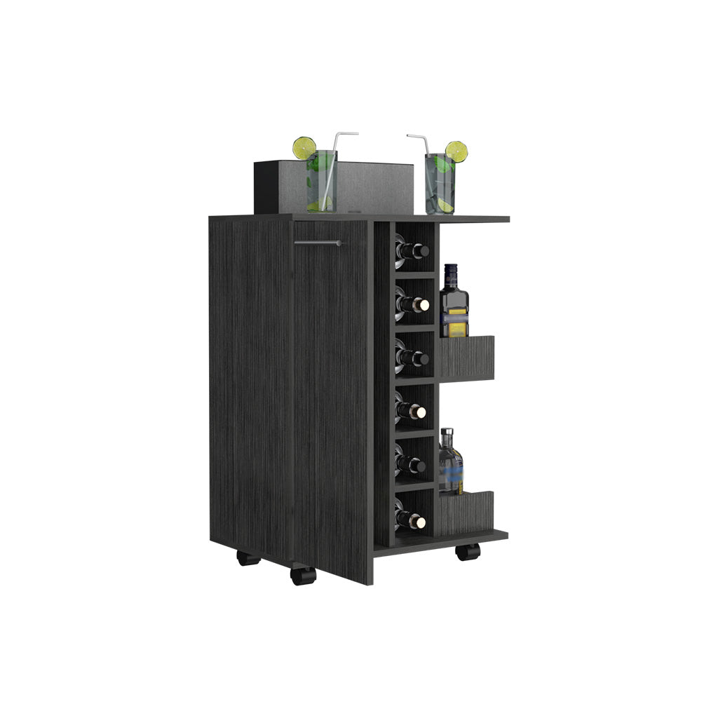 Bar Cart Wells, Four Casters, Six Wine Cubbies, Single Door Cabinet, Smokey Oak Finish Gray Particle Board