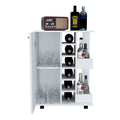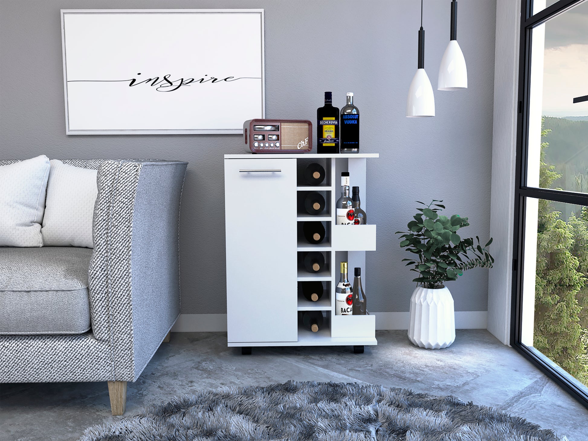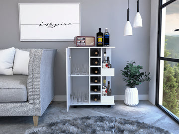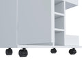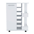 Bar Cart Wells, Four Casters, Six Wine Cubbies, Single Door Cabinet, White Finish White Particle Board