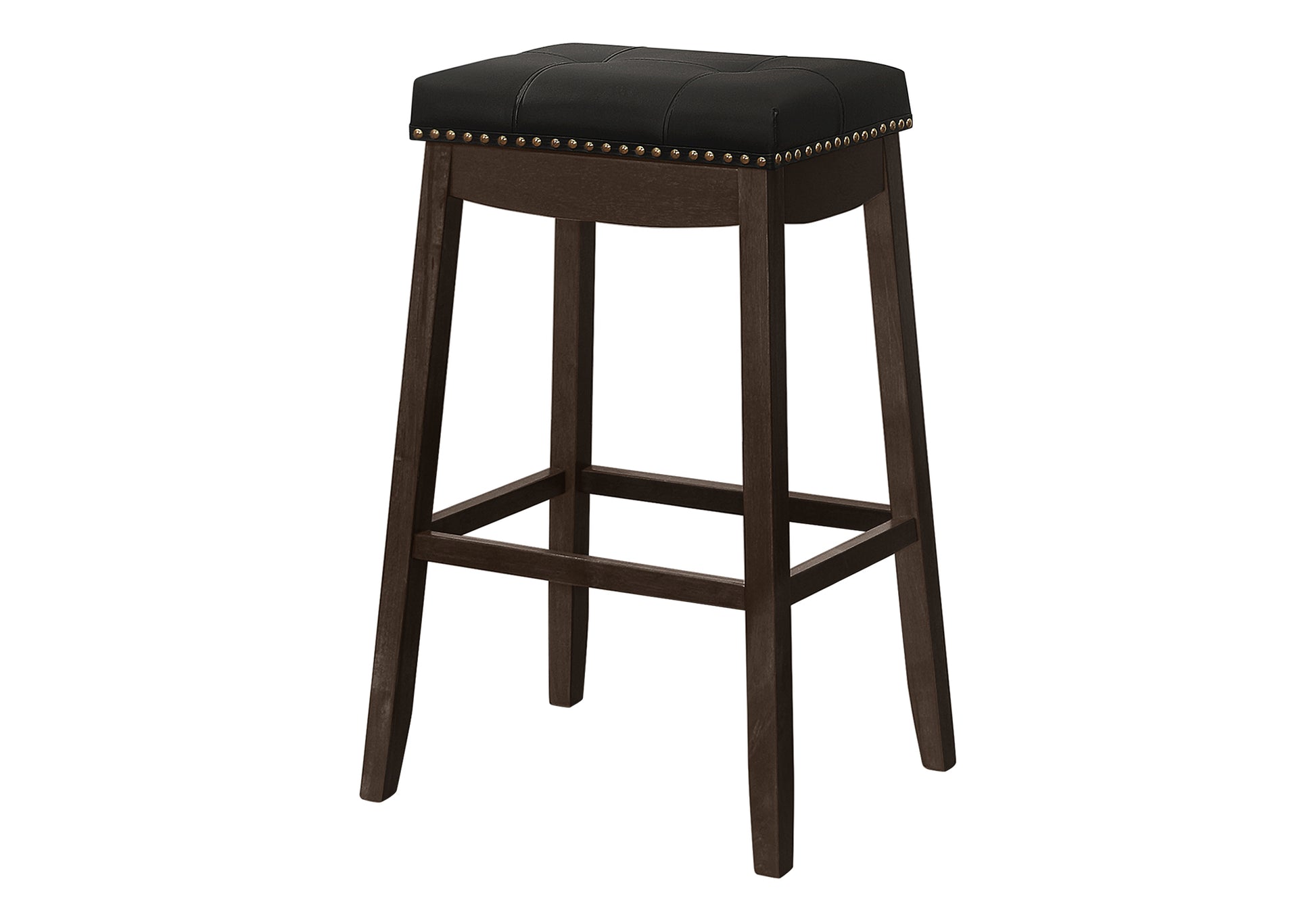 Bar Stool, Set Of 2, Bar Height, Saddle Seat, Brown Wood, Black Leather Look, Transitional Espresso Foam Solid Wood