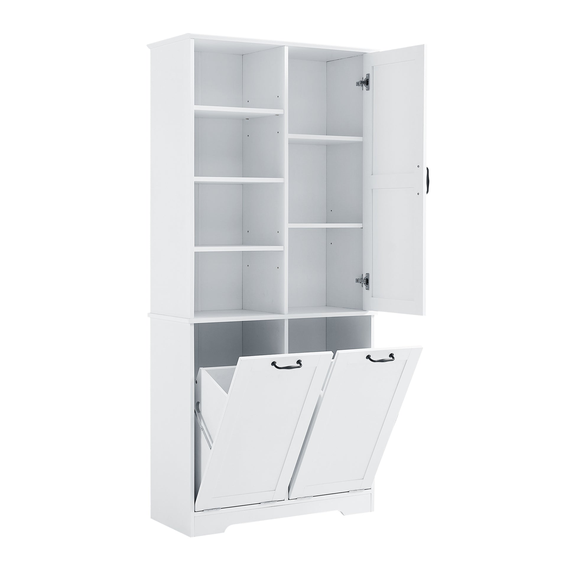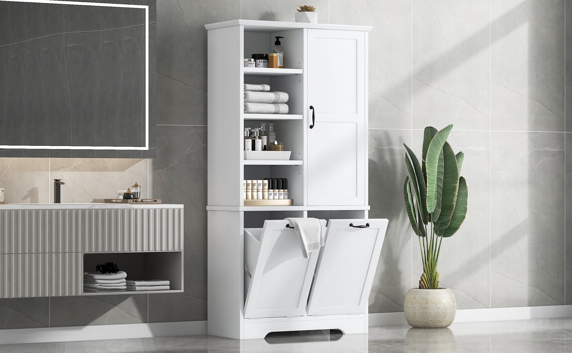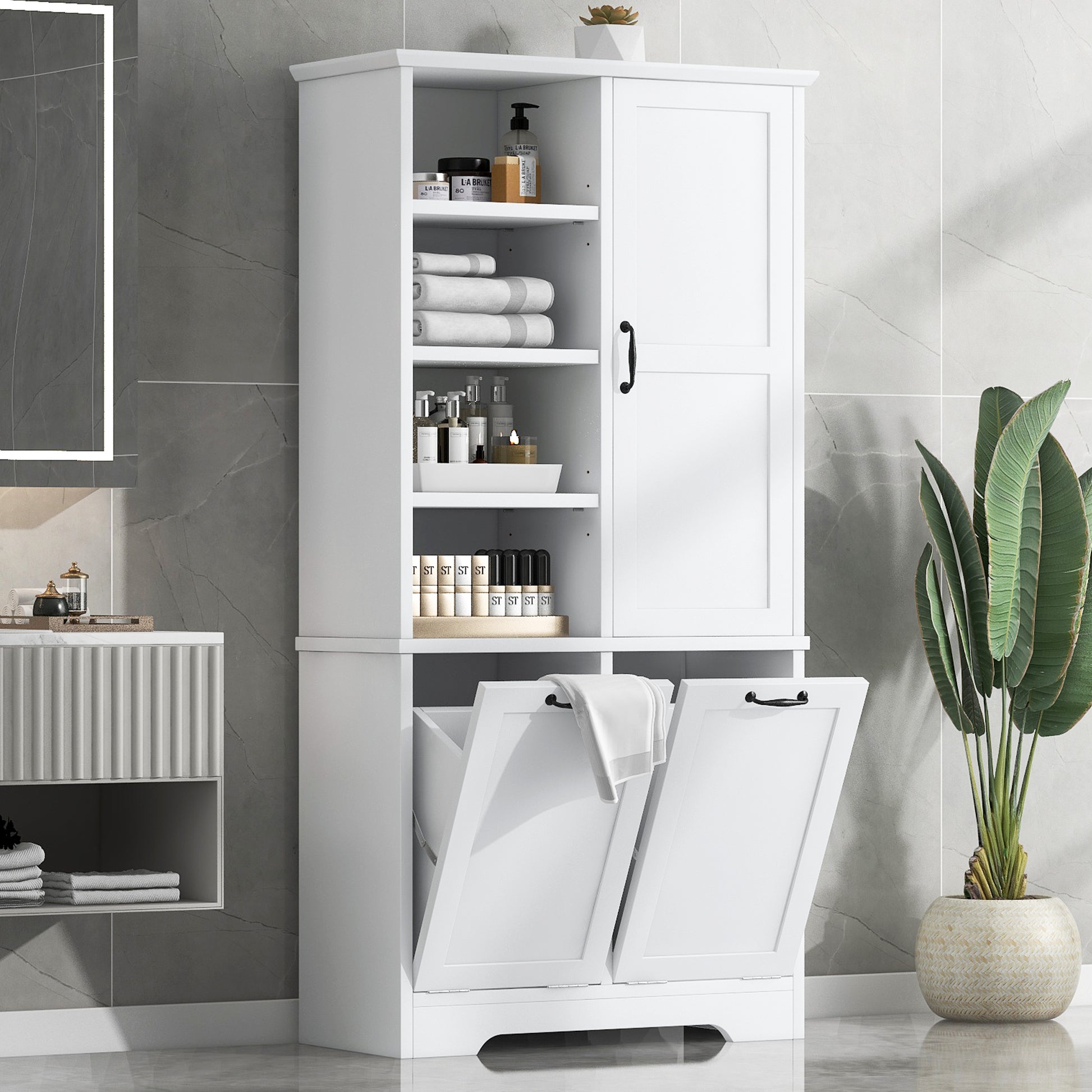 Bathroom Storage Cabinet With Doors And Drawers, Tilt Out Laundry Hamper, Multiple Storage Space, Freestanding Style, Open Shelve, Adjustable Shelf, White White Mdf