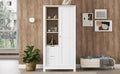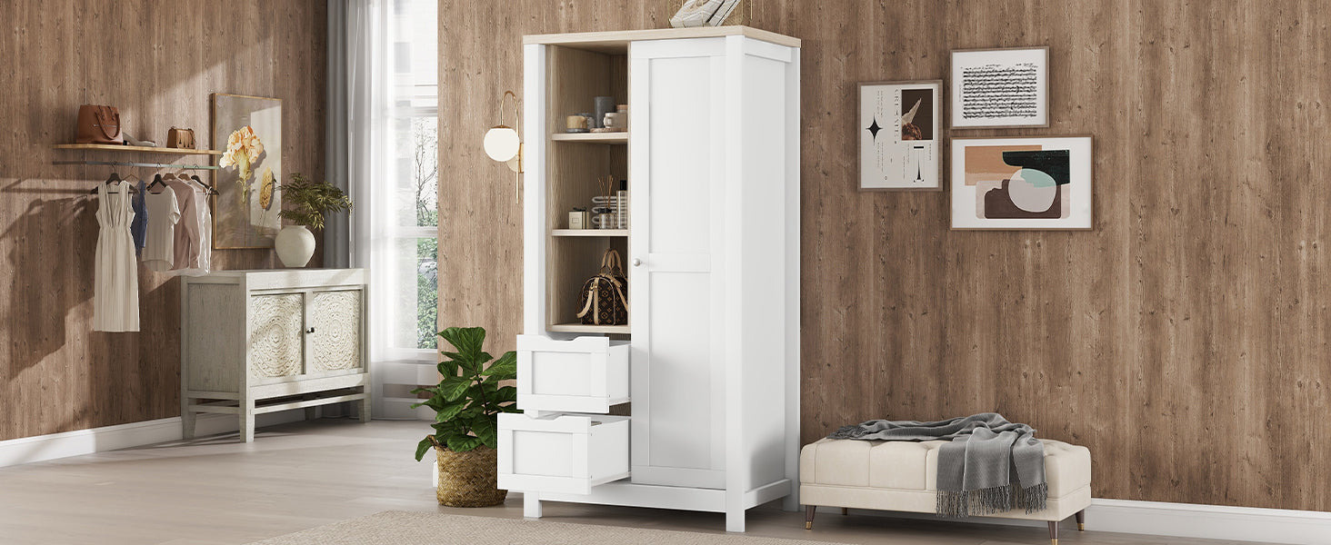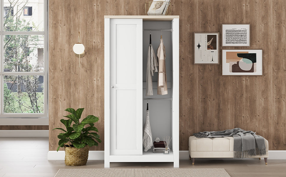 Bedroom Storage Wardrobe With Hanging Rods And 2 Drawers And Open Shelves,Sliding Door,White White Mdf