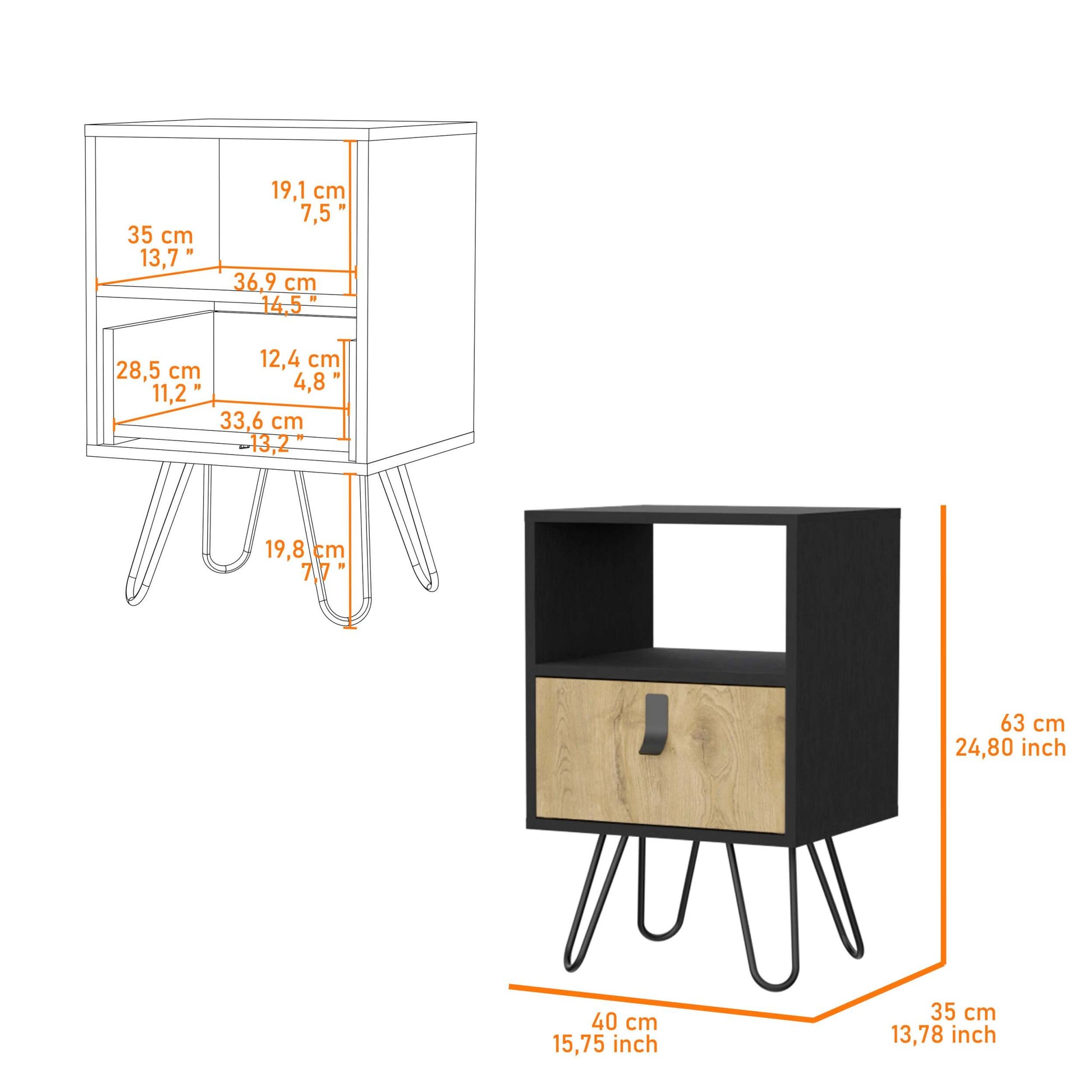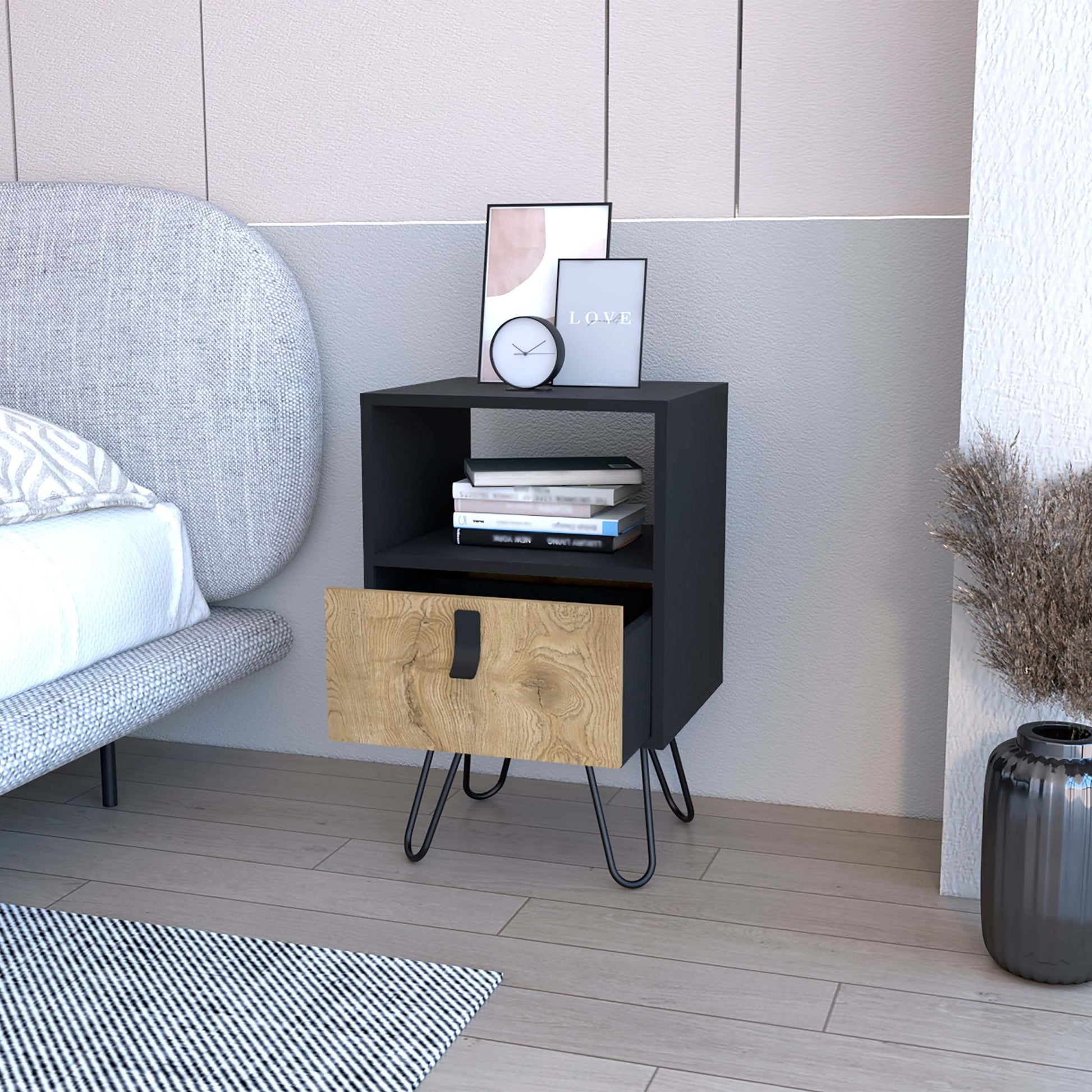 Black And Macadamia Hairpin Legs Nightstand Black Natural 1 Drawer Bedroom Drawer Storage Storage Wood