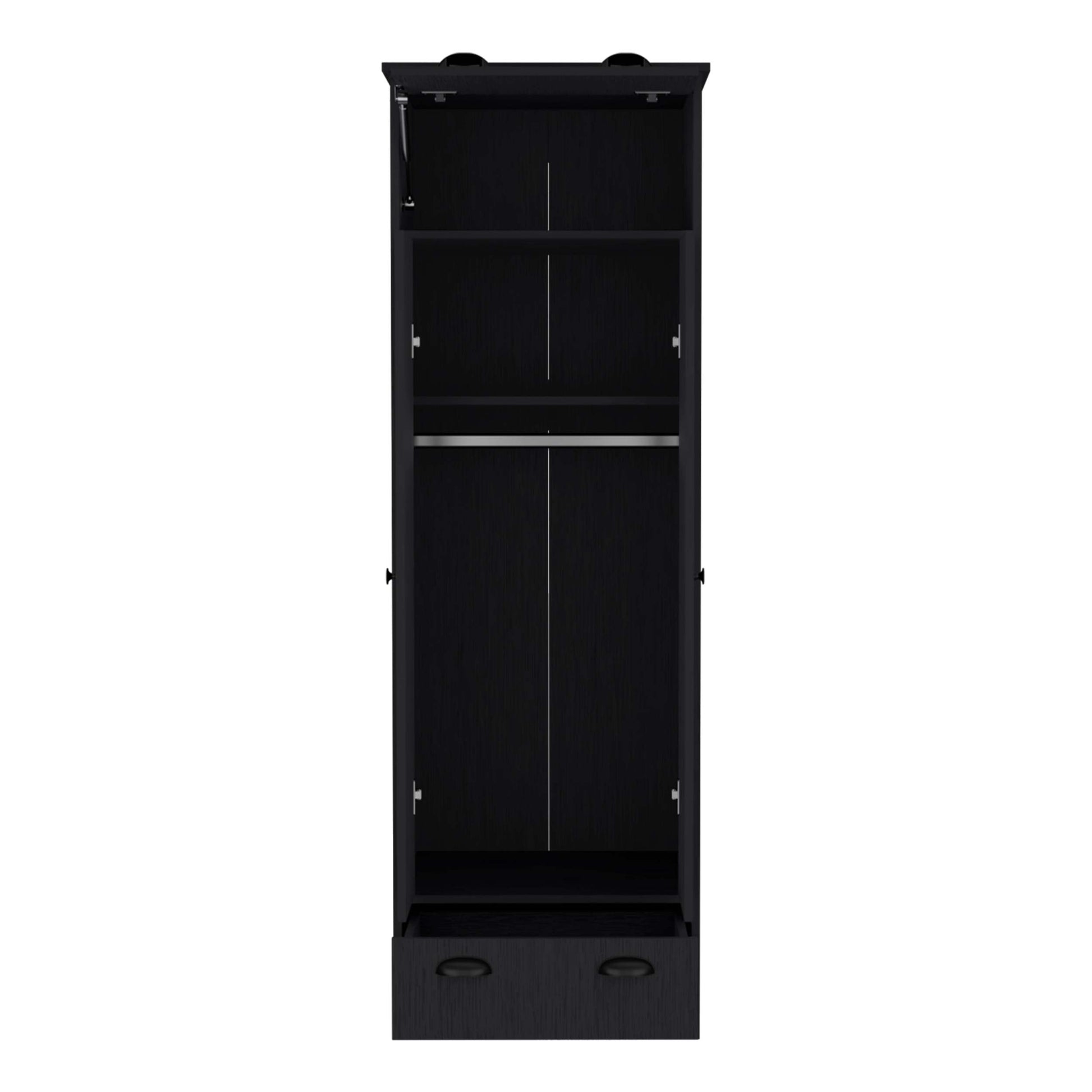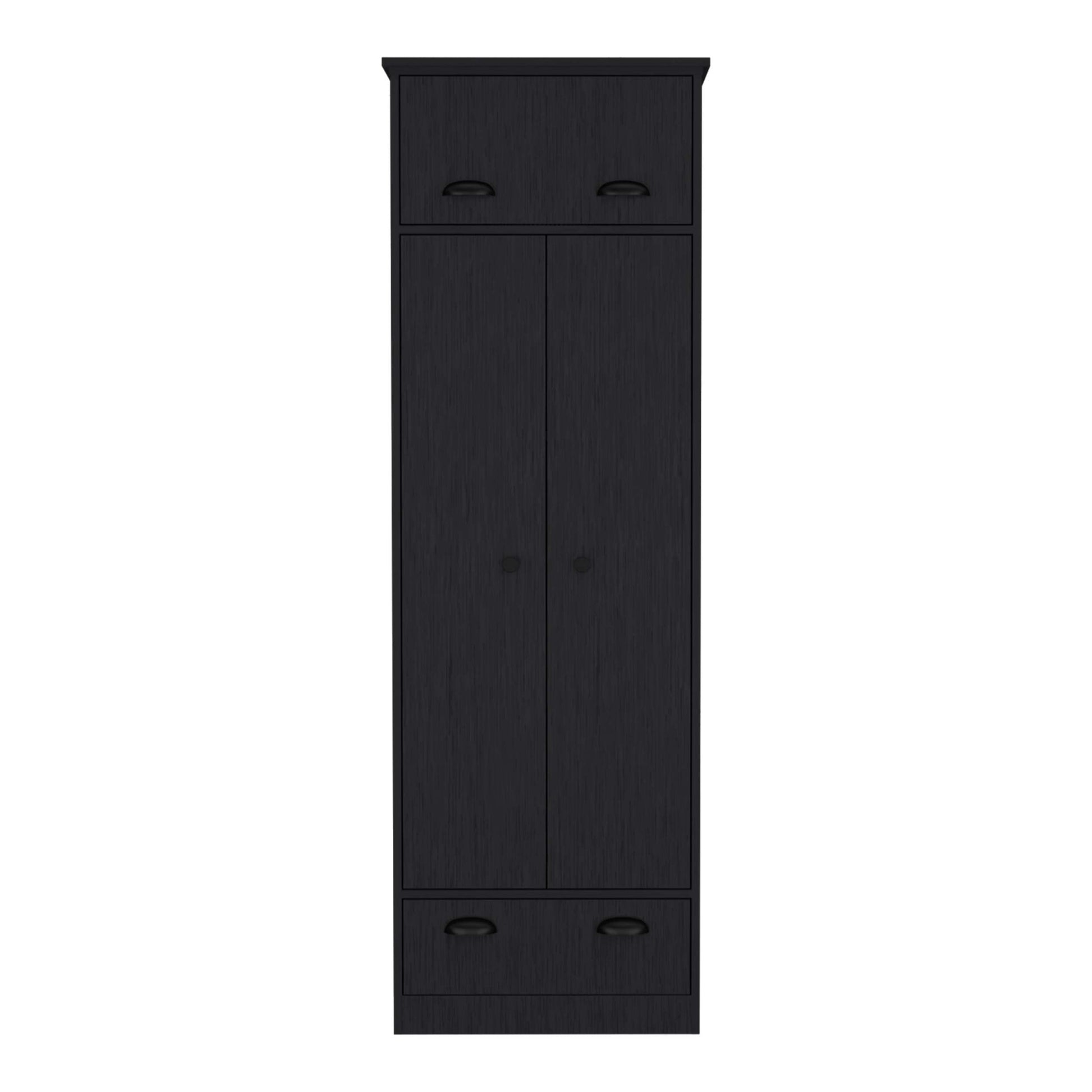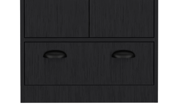 Black Dresser Closet With Upper Storage Covered With 1 Door, This Wardrobe Also Has 2 Central Shelves And 1 Tube For Hanging Clothes Covered By 2 Doors, And 1 Drawer At The Bottom. Black Particle Board Particle Board