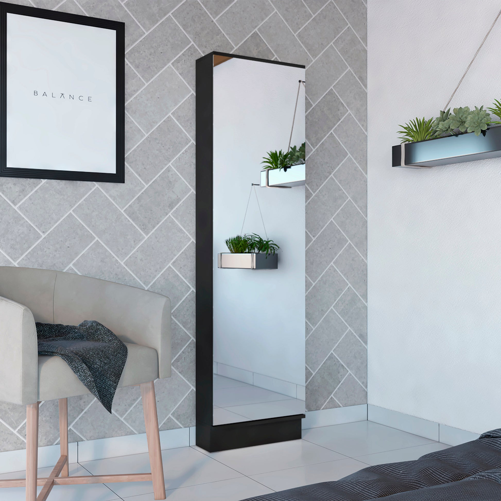 Black Wengue Rectangle Tall Shoe Cabinet With Mirror Black Particle Board