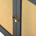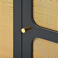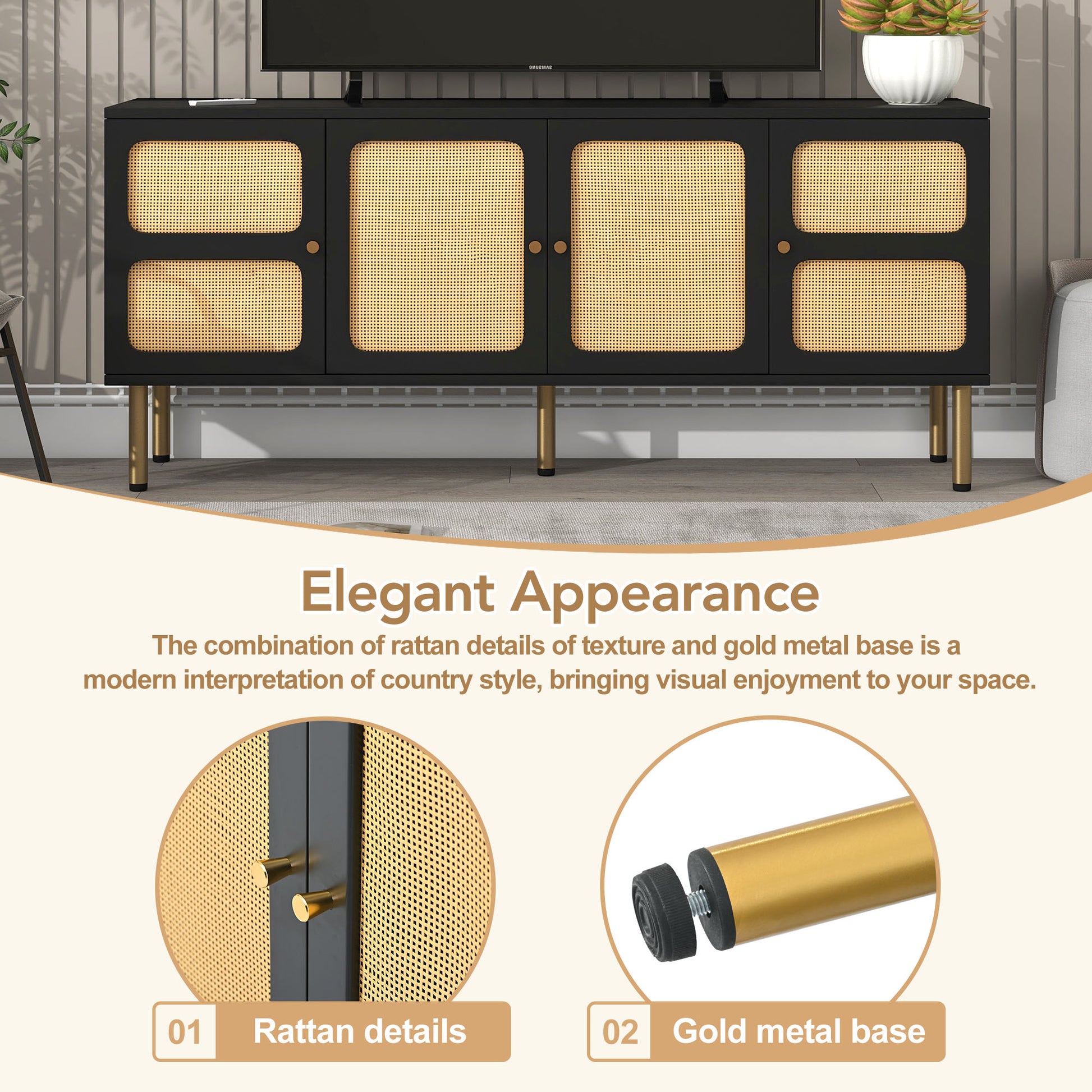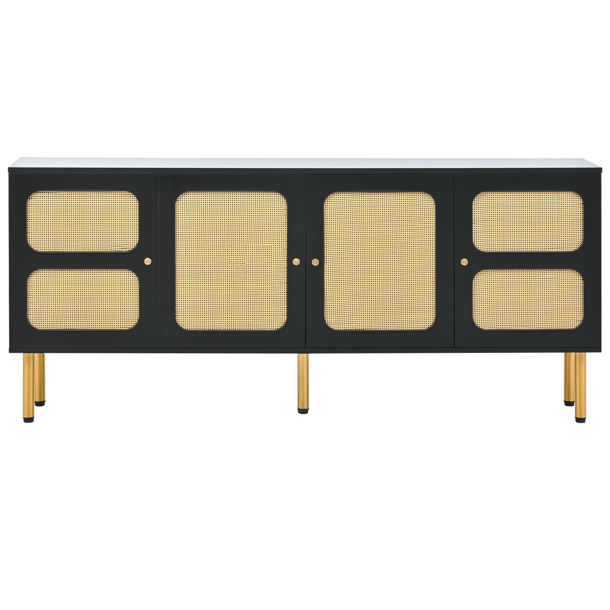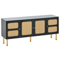 Boho Style Tv Stand With Rattan Door, Woven Media Console Table For Tvs Up To 70'', Country Style Design Side Board With Gold Metal Base For Living Room, Black. Black Mdf