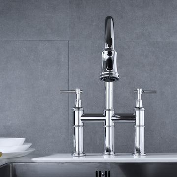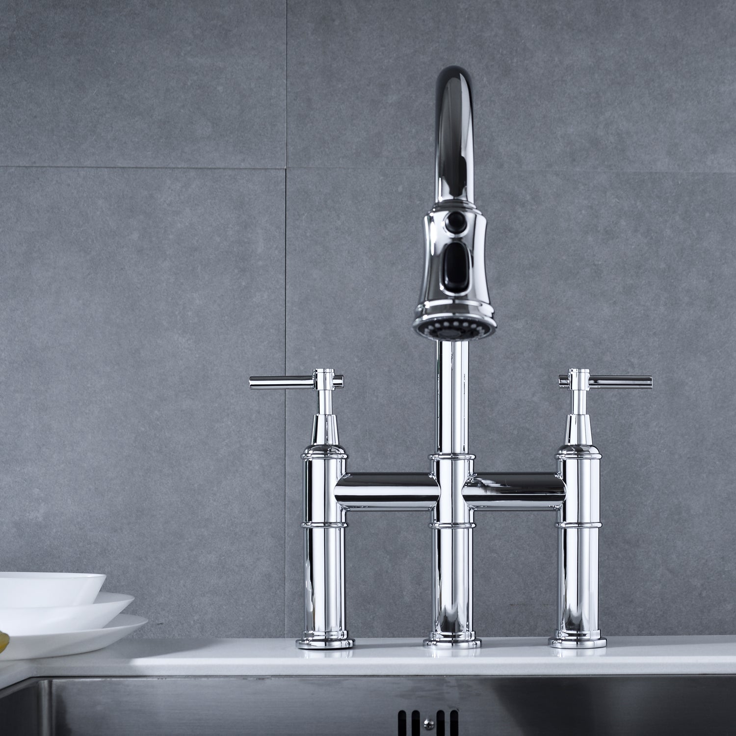 Bridge Kitchen Faucet With Pull Down Sprayhead In Spot Chrome Brass