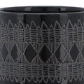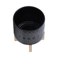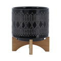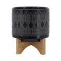 Ceramic 8" Aztec Planter On Wooden Stand, Black Black Ceramic