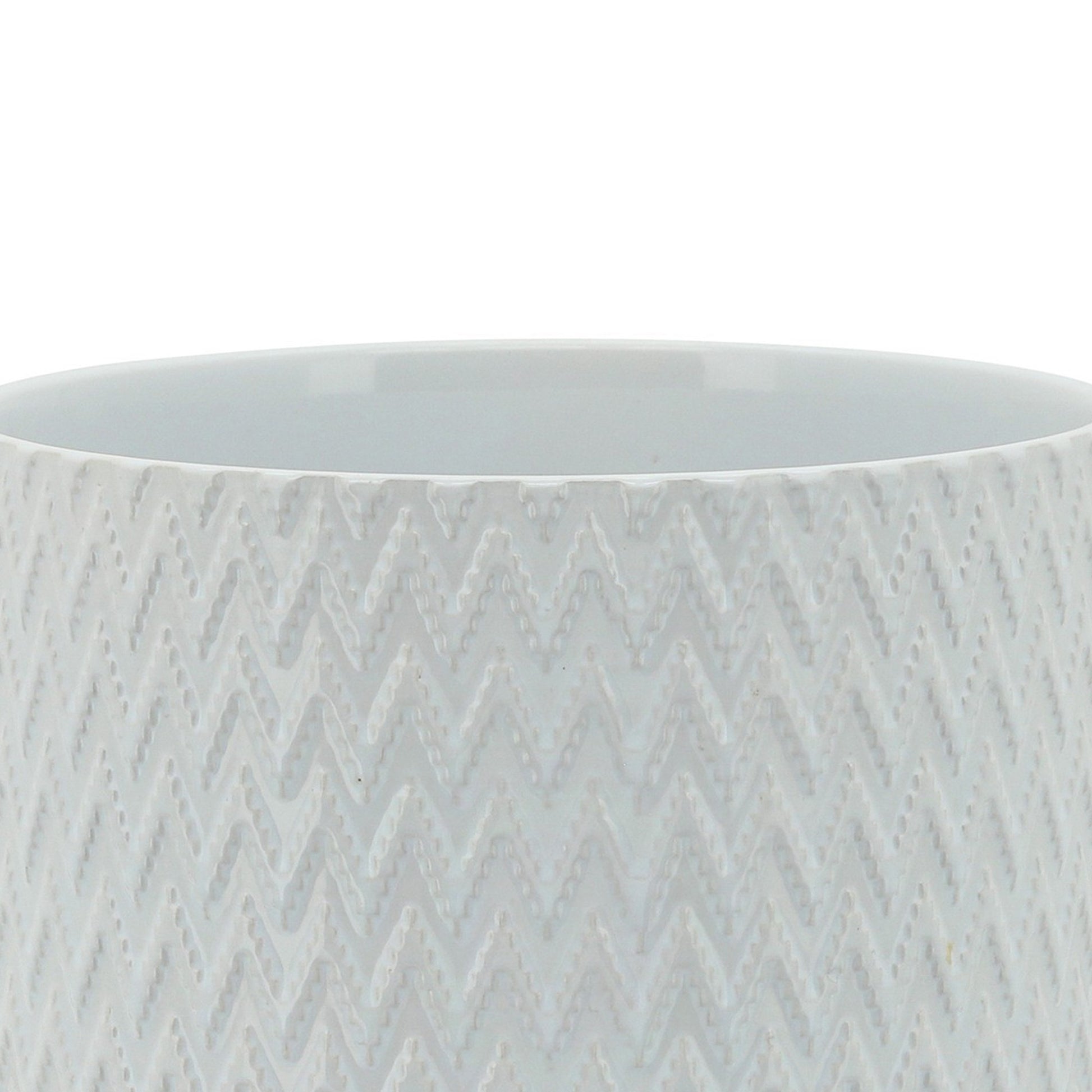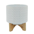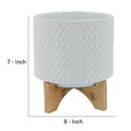 Ceramic Planter With Chevron Pattern And Wooden Stand, Small, White White Wood