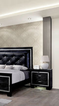 Features:-ContemporaryBlackMirror, Solid Wood, Wood Veneer, OthersFelt-lined Top DrawersDiamond Crusted Bar Pull HandlesEnglish Dovetail Drawer ConstructionLED Light on Night StandCrocodile-Textured Detail w/ 3mm Mirror Inserts