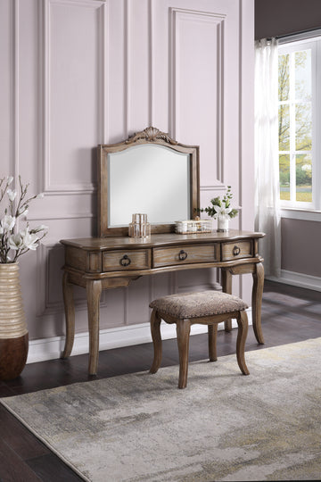 Functional and Chic, the Vanity Desk Set is perfect for small spaces. Its rich finish gives a warm feel to any room with stylish details such as spacious desk-top, bowed top front, cabriole-tapered legs, and arched mirror with floral crown molding. The matching stool features a padded cushion and nail-trim accents. Its three storage drawers include vintage ring-pull handles to complement the traditional look.