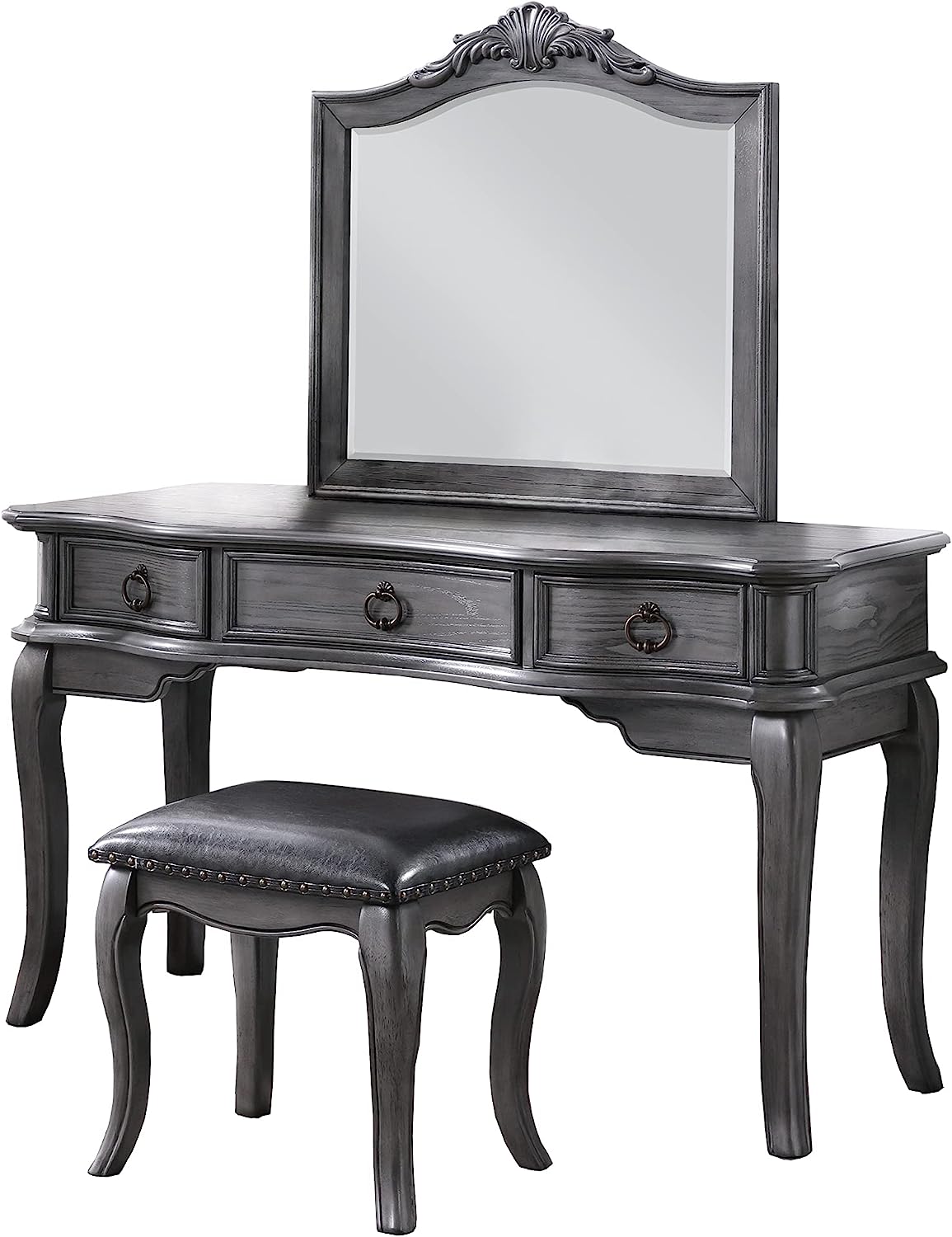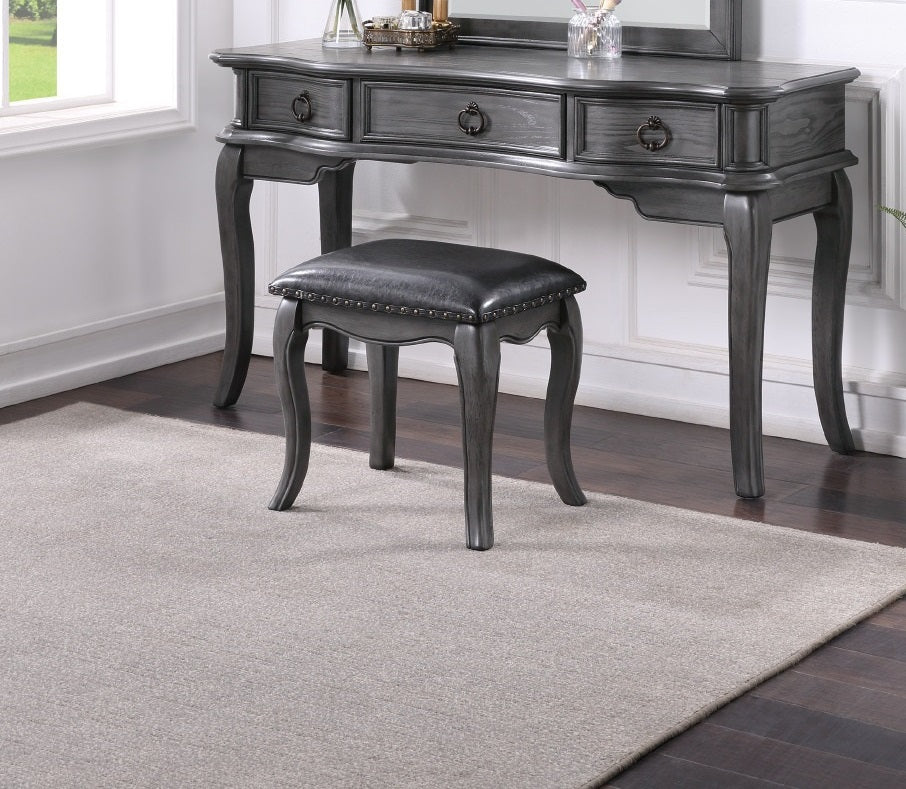 Contemporary Grey Finish Vanity Set W Stool Retro Style Drawers Cabriole Tapered Legs Mirror W Floral Crown Molding Bedroom Furniture Grey Gray Bedroom Contemporary Poplar Rubber Wood