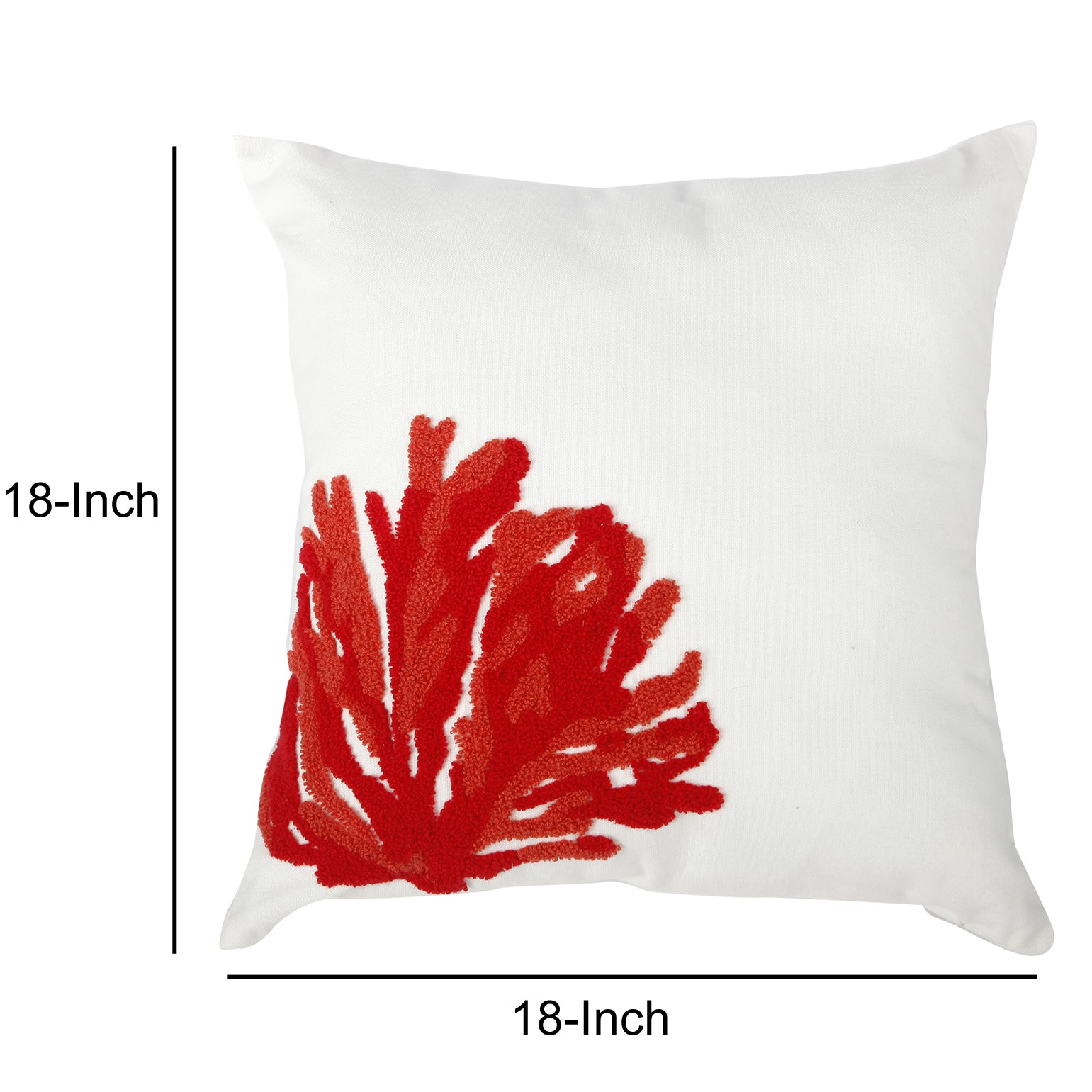 Contemporary Style Pillow With Coral Embroidery, Red And White. White Polyester