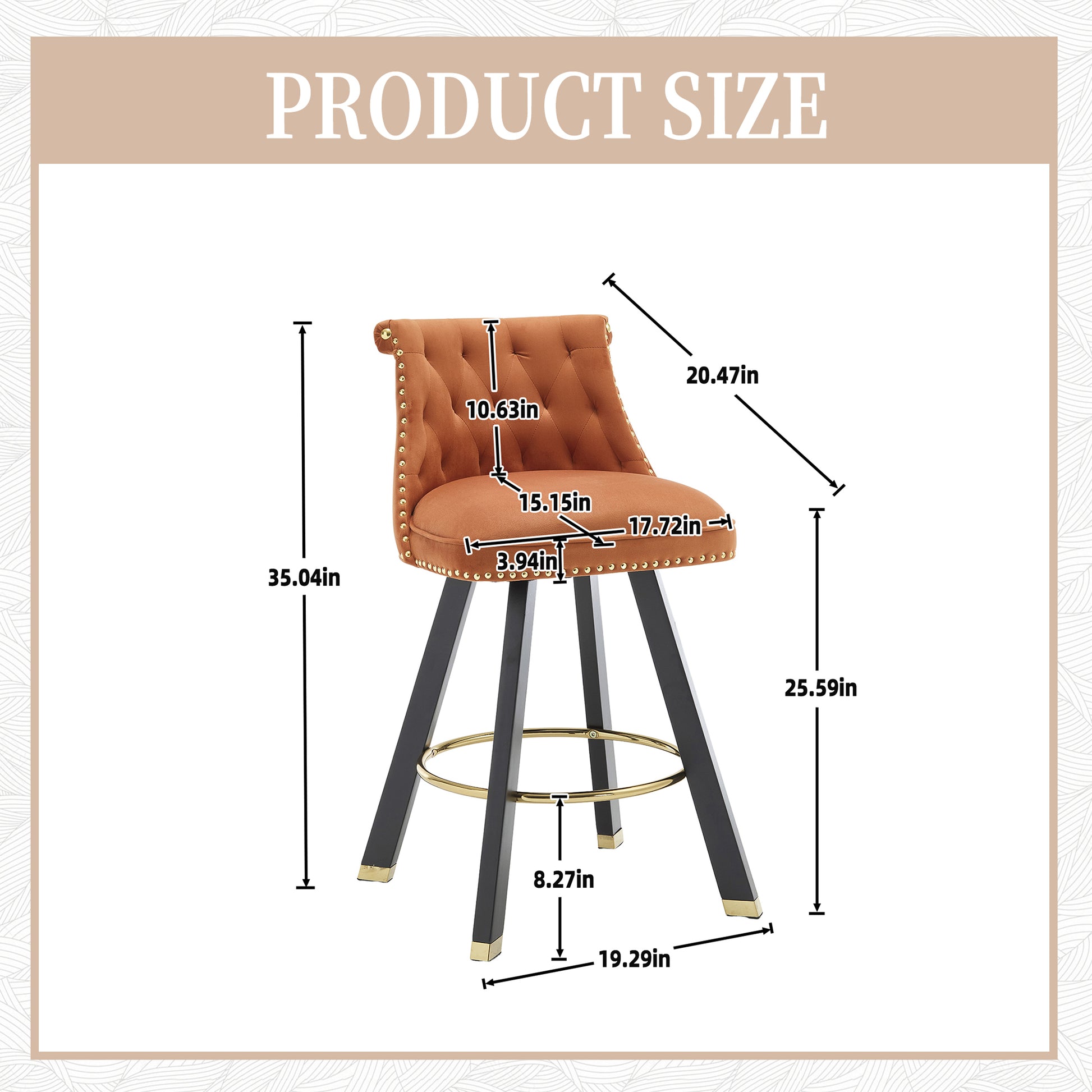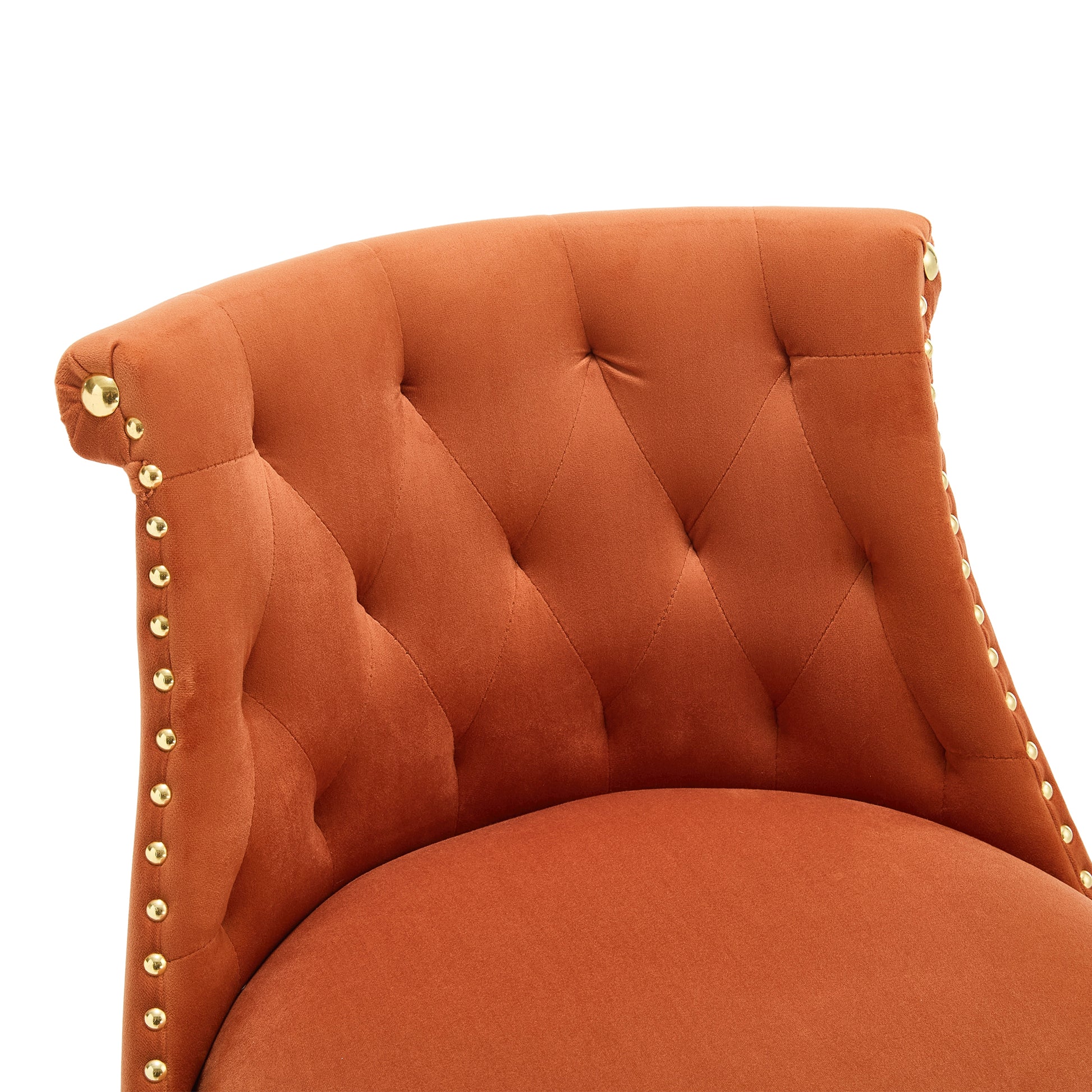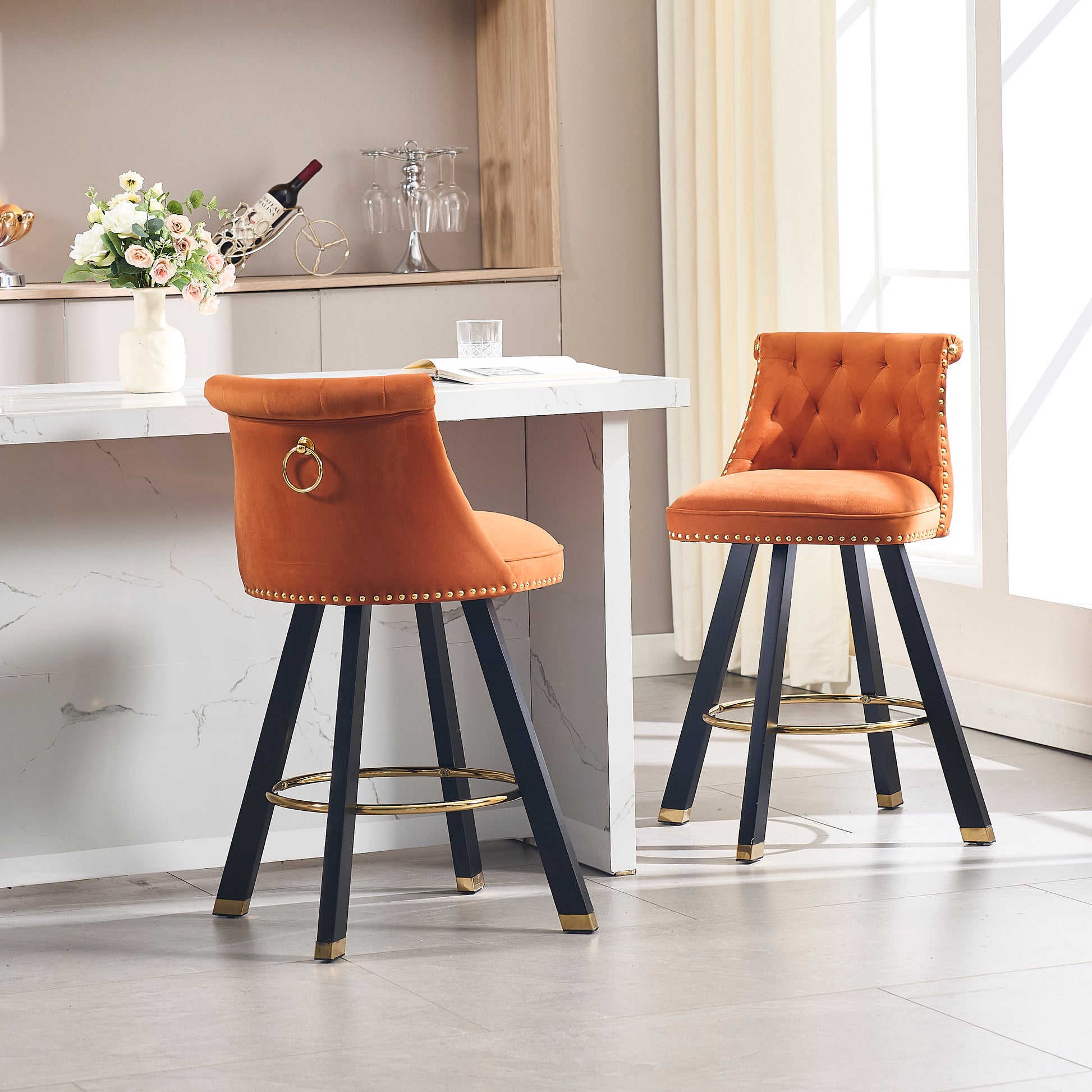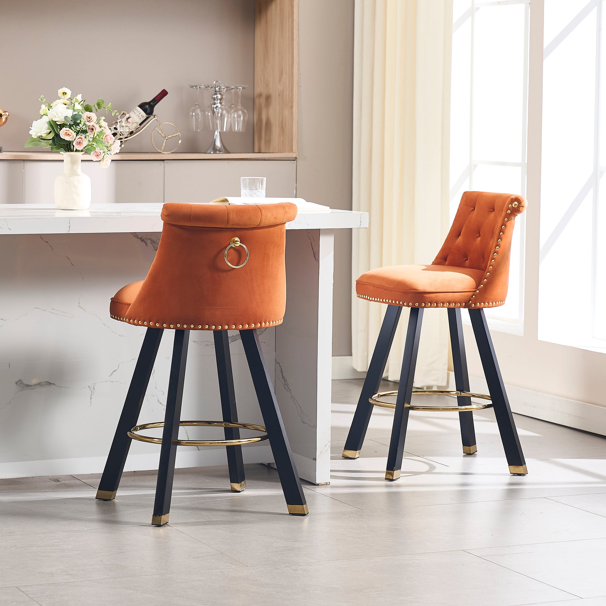 Coolmore Set Of 2,Back Pull Point Design, Velvet Material, 360 Degree Rotation, Back Pull Loop Detachable Design, Rivet Decoration, Square Foot Wooden Bar Chair Orange Velvet