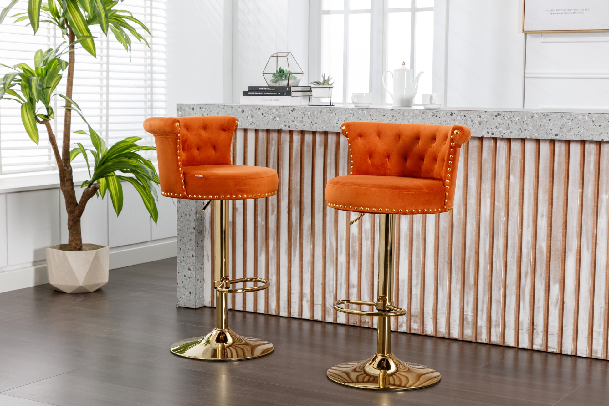 Coolmore Swivel Bar Stools Set Of 2 Adjustable Counter Height Chairs With Footrest For Kitchen, Dining Room 2Pc Set Orange Velvet