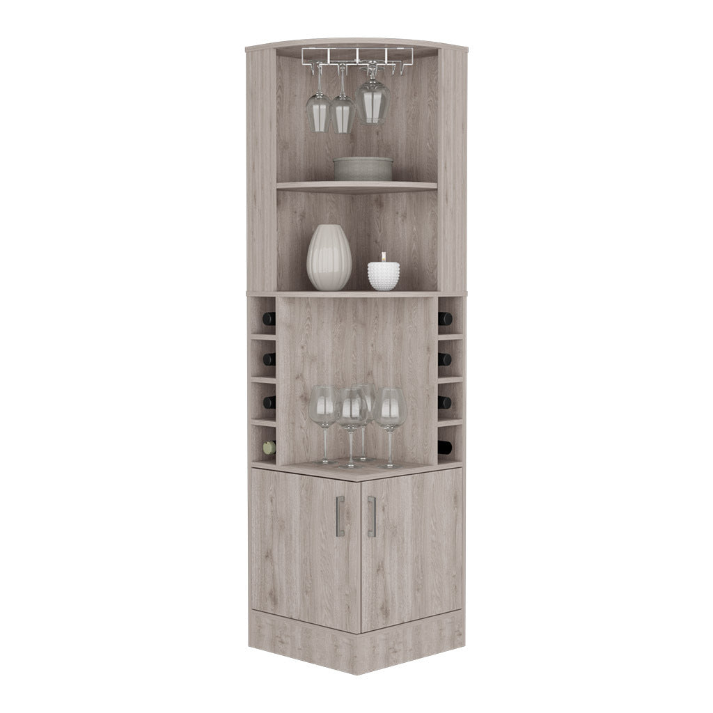 Corner Bar Cabinet 71" H, With Two Shelves At The Top, 1 Glass Holder, 8 Exterior Bottle Racks, 1 Central Shelf And A Lower Drawer With 2 Side Doors, Light Gray Gray Particle Board Particle Board
