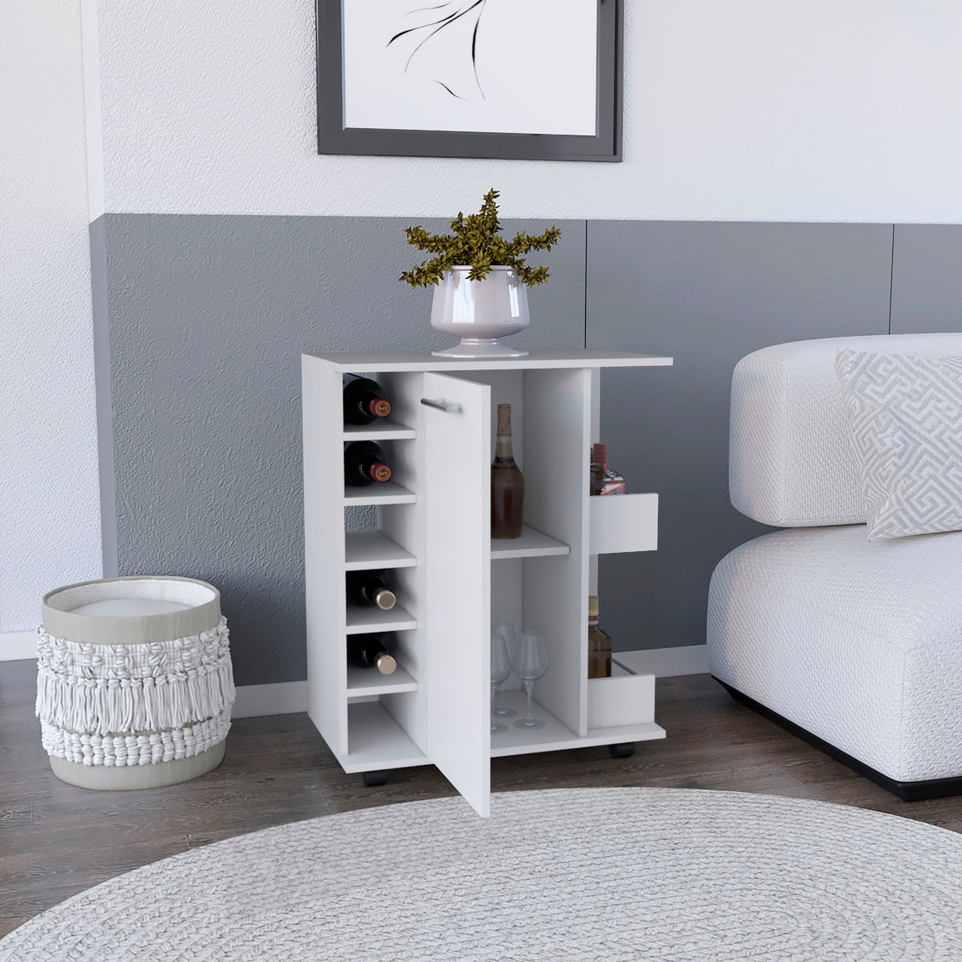 Depot E Shop Selden Bar Cart With 6 Built In Bottle Racks, Casters And 2 Open Side Shelves, White White Particle Board Particle Board
