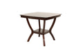 Imperial design is provided with this dining room chairs set perfect for large gatherings of family and friends. The Square shaped dining room table in covered in dark brown wood veneer surrounded by espresso upholstered chairs trimmed and framed in the same wood finish.