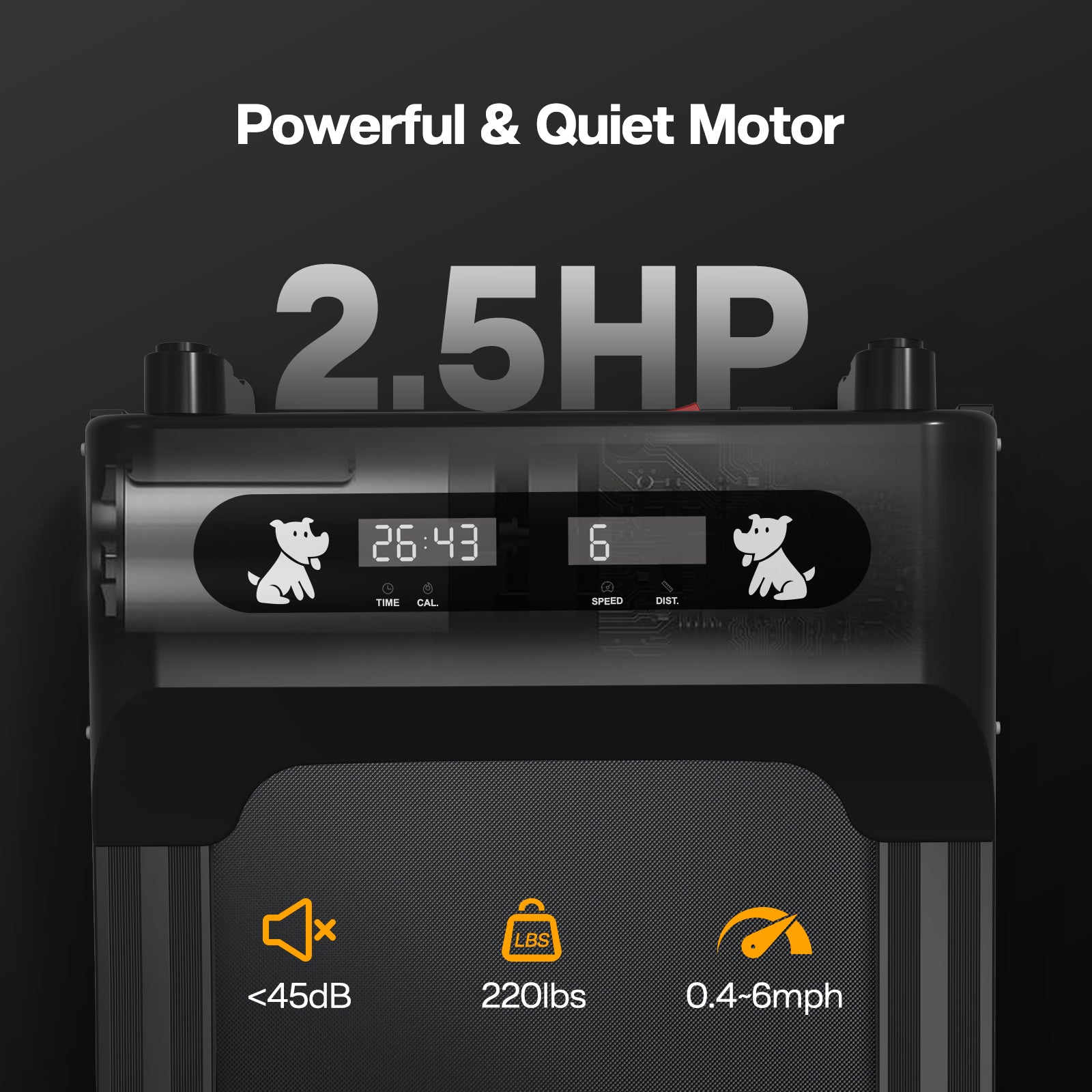 • Motor Power: 2.5hp Rated Voltage: 110v / 50Hz Speed: 0.5-6.5mph (1-10km/h) Display: Time, Speed, Calorie, Distance, Step User Capacity: 220LBS