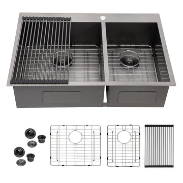 Double Bowl Drop In Sink 33"X22" Gunmetal Black Double Bowl Kitchen Sink 18 Gauge With Two 9" Deep Basin Gunmetal Black Stainless Steel