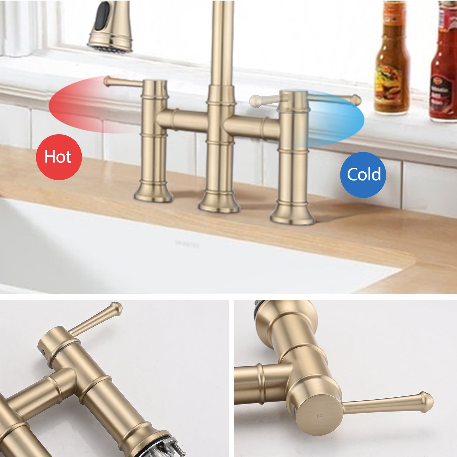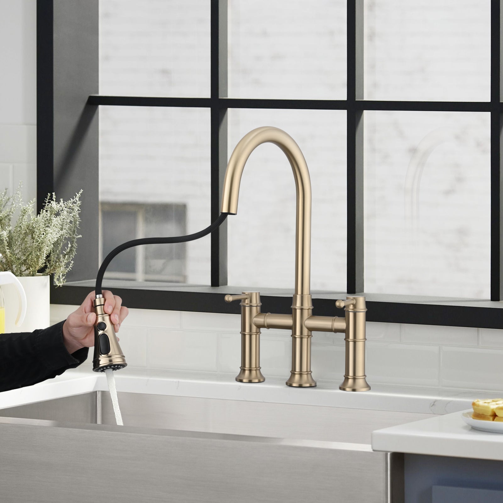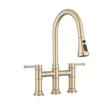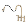 Double Handle Bridge Kitchen Faucet With Pull Down Spray Head Brushed Gold Stainless Steel