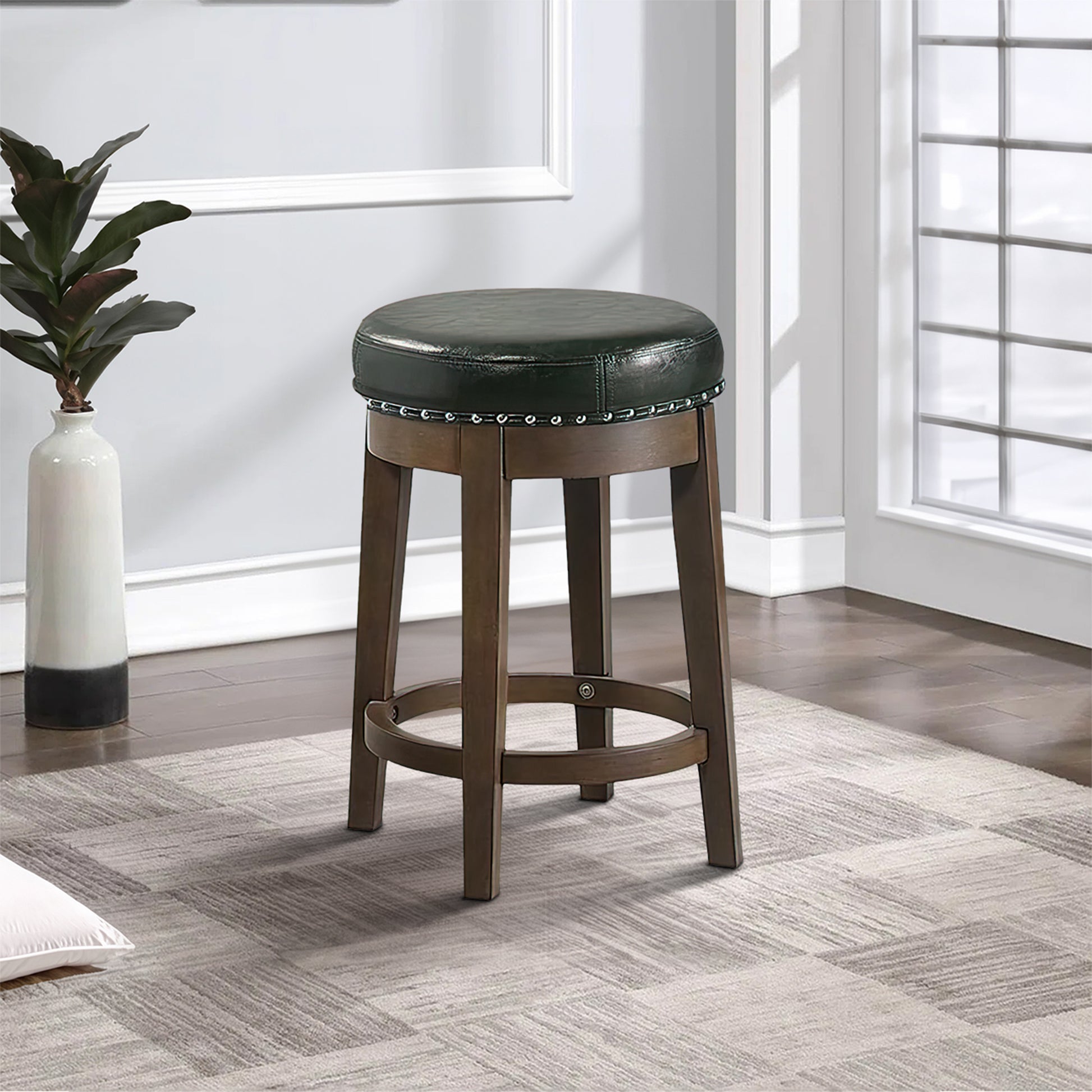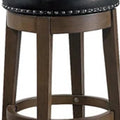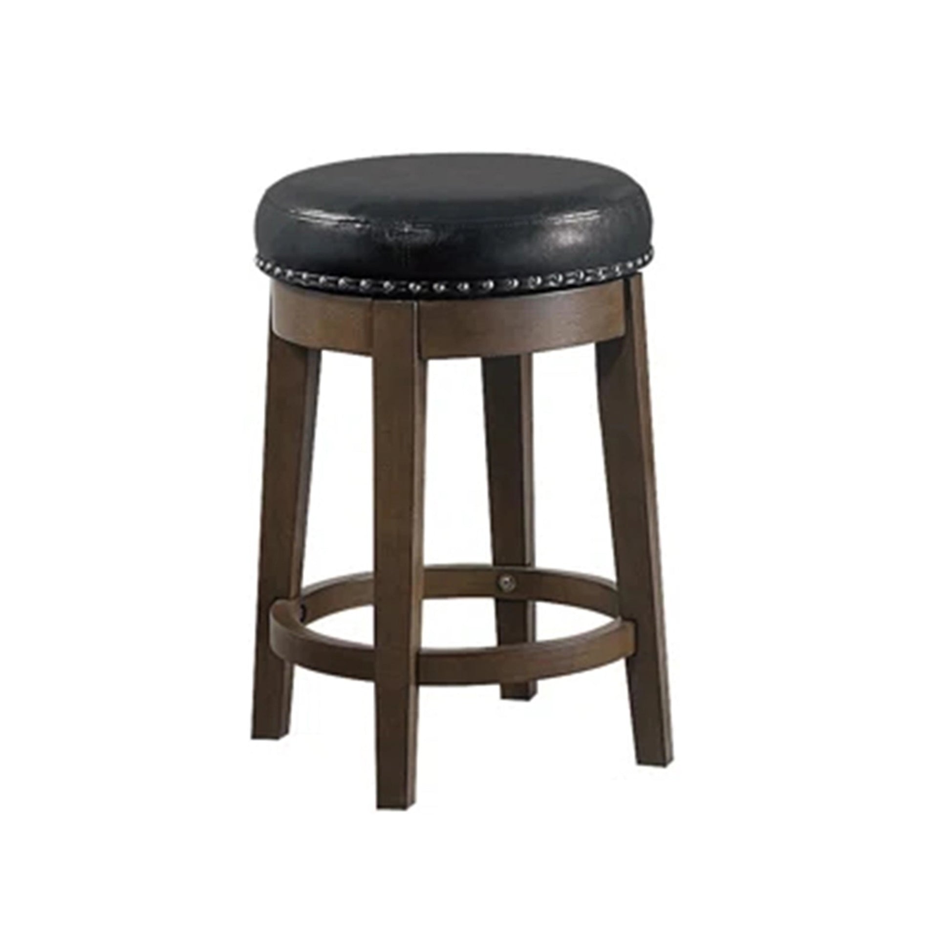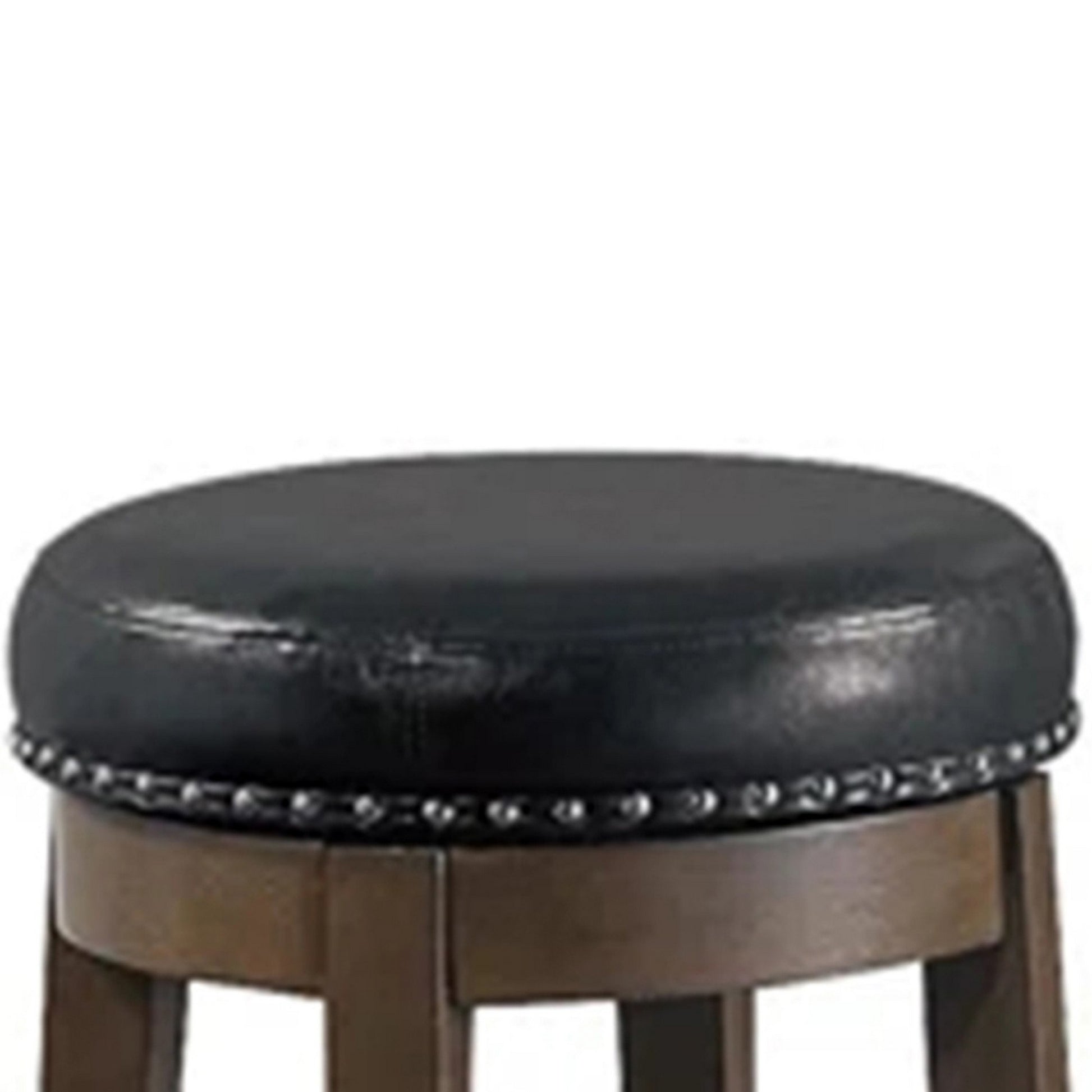 Drue 24 Inch Set Of 2 Swivel Counter Stools, Brown Wood Black Faux Leather Black Brown Wood Fabric
