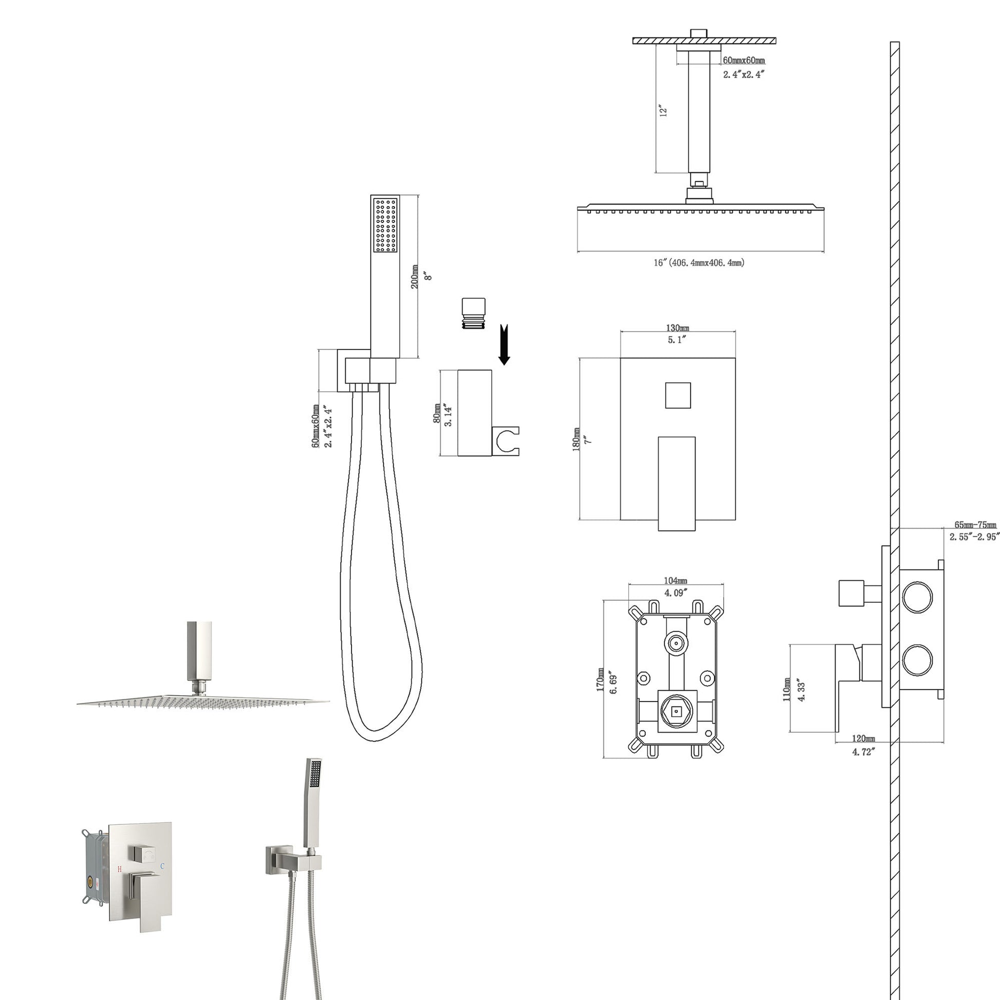 Dual Shower Head 16 Inch Ceiling Mount Square Shower System With Rough In Valve, Brushed Nickel Brushed Nickel Stainless Steel