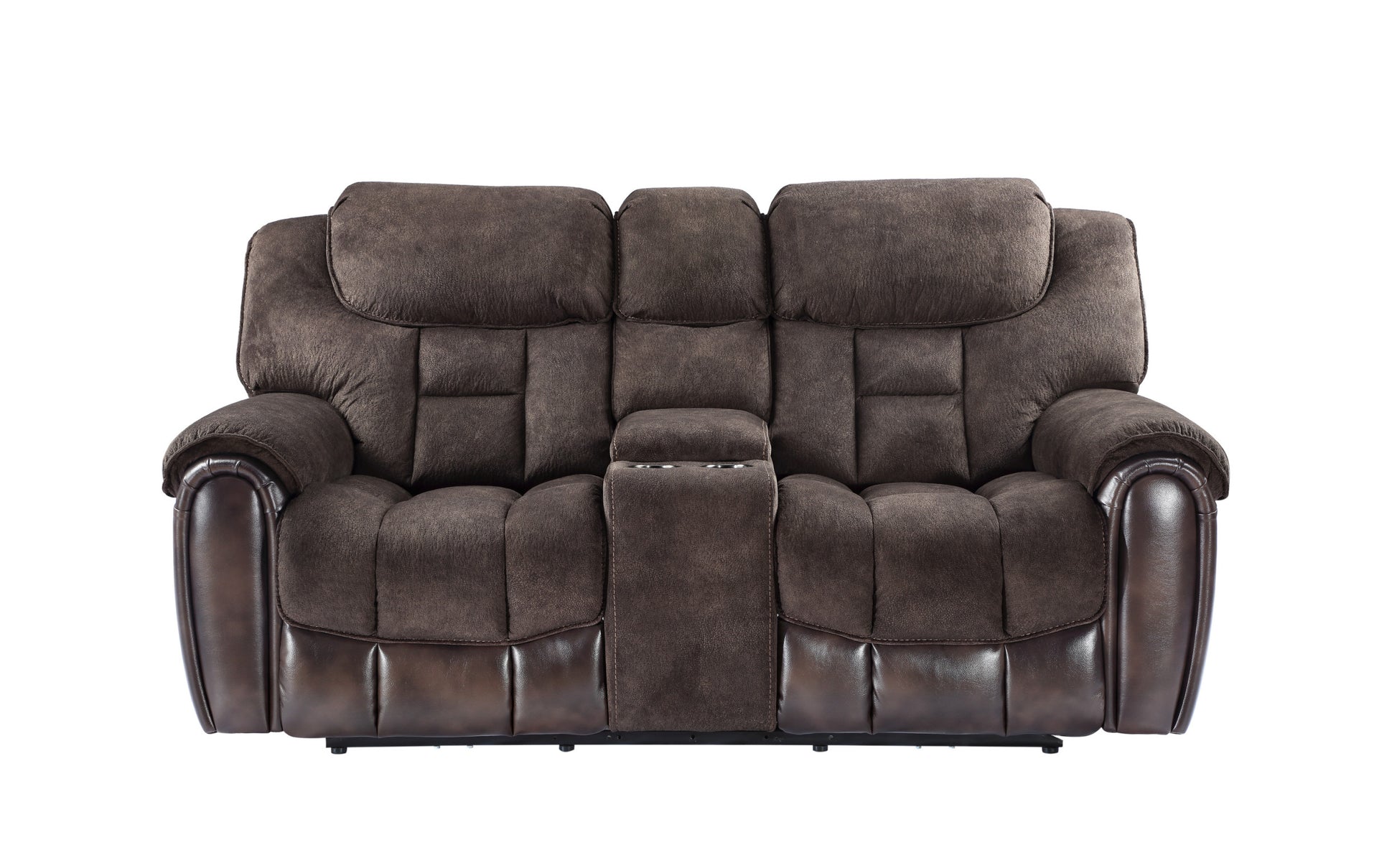 Easy Care Loveseat With Pleated Back Ultra Plush Fabric, Multi Function Drop Down Console, Pop Up Charging Station Complete 3 Piece Set Espresso Foam Leather