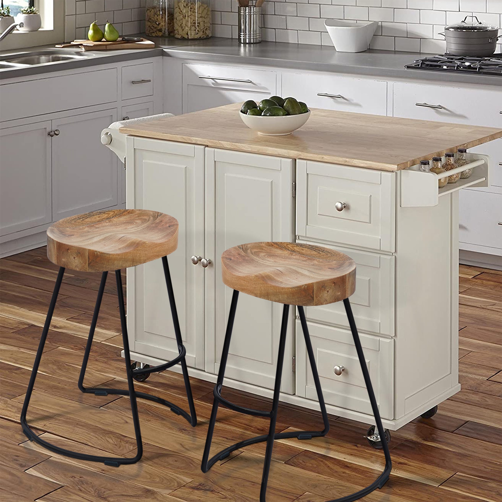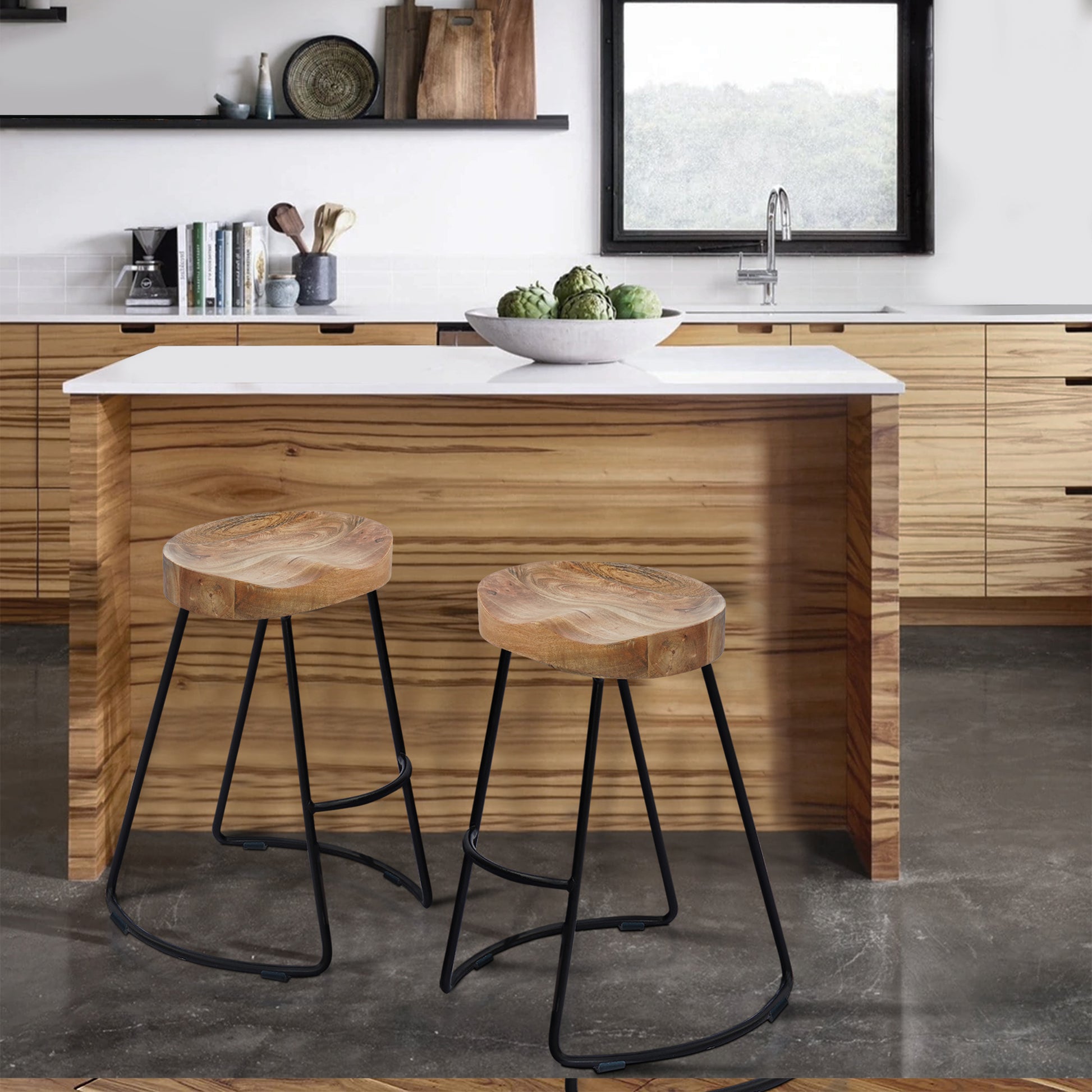 Ela 24 Inch Counter Height Stool, Mango Wood Saddle Seat, Iron Frame, Brown And Black Black Brown Metal & Wood