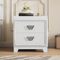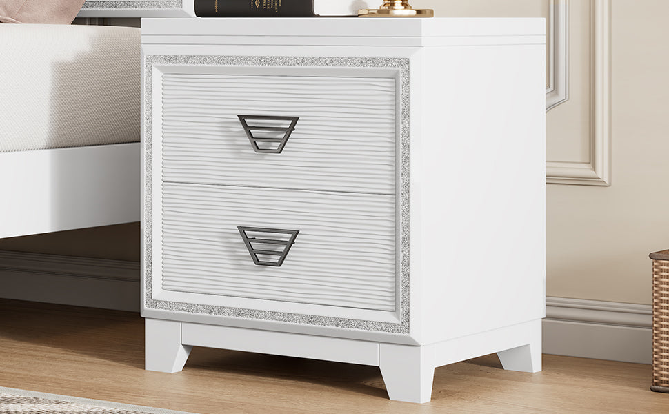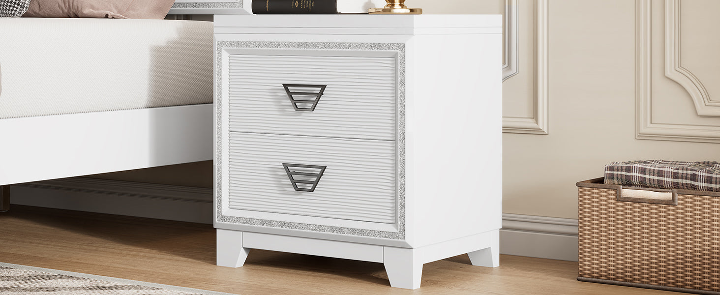 Elegant Nightstand With Metal Handle And Sparkling Shiny Decoration, Bedside Table With 2 Drawers For Bedroom, Living Room, White White 2 Drawers Mdf