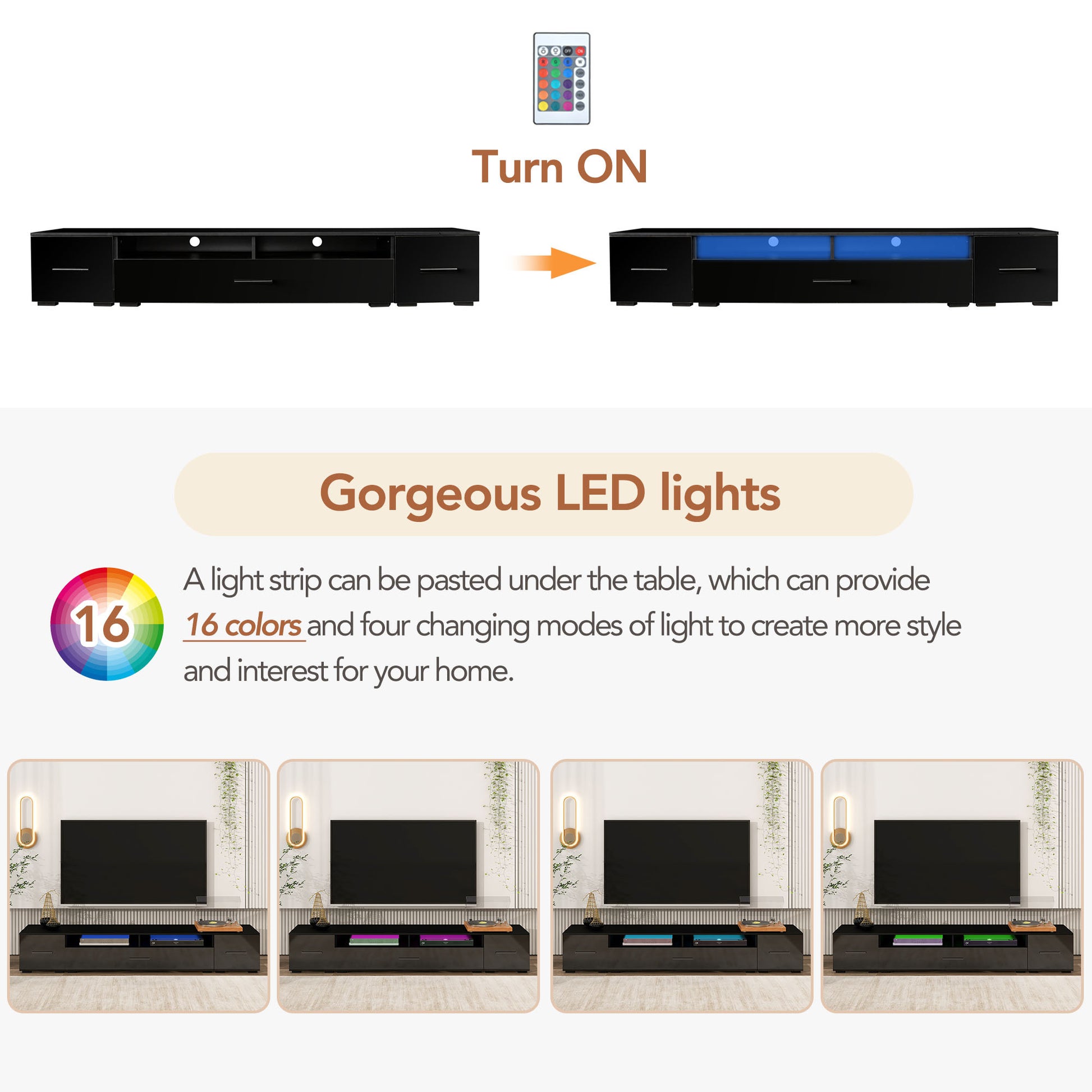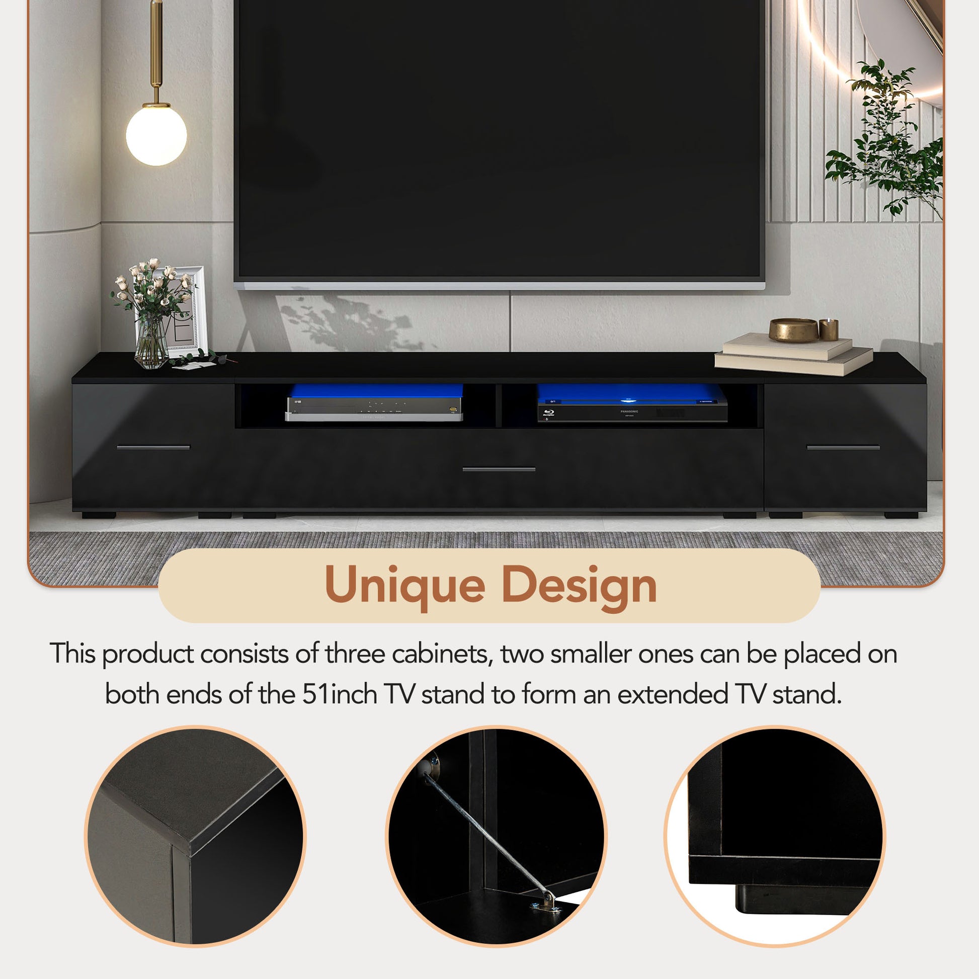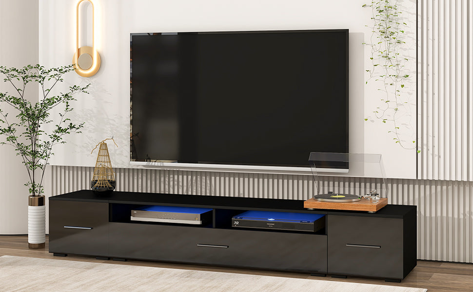 Extended, Minimalist Design Tv Stand With Color Changing Led Lights, Modern Universal Entertainment Center, High Gloss Tv Cabinet For 90 Inch Tv, Black Black Particle Board