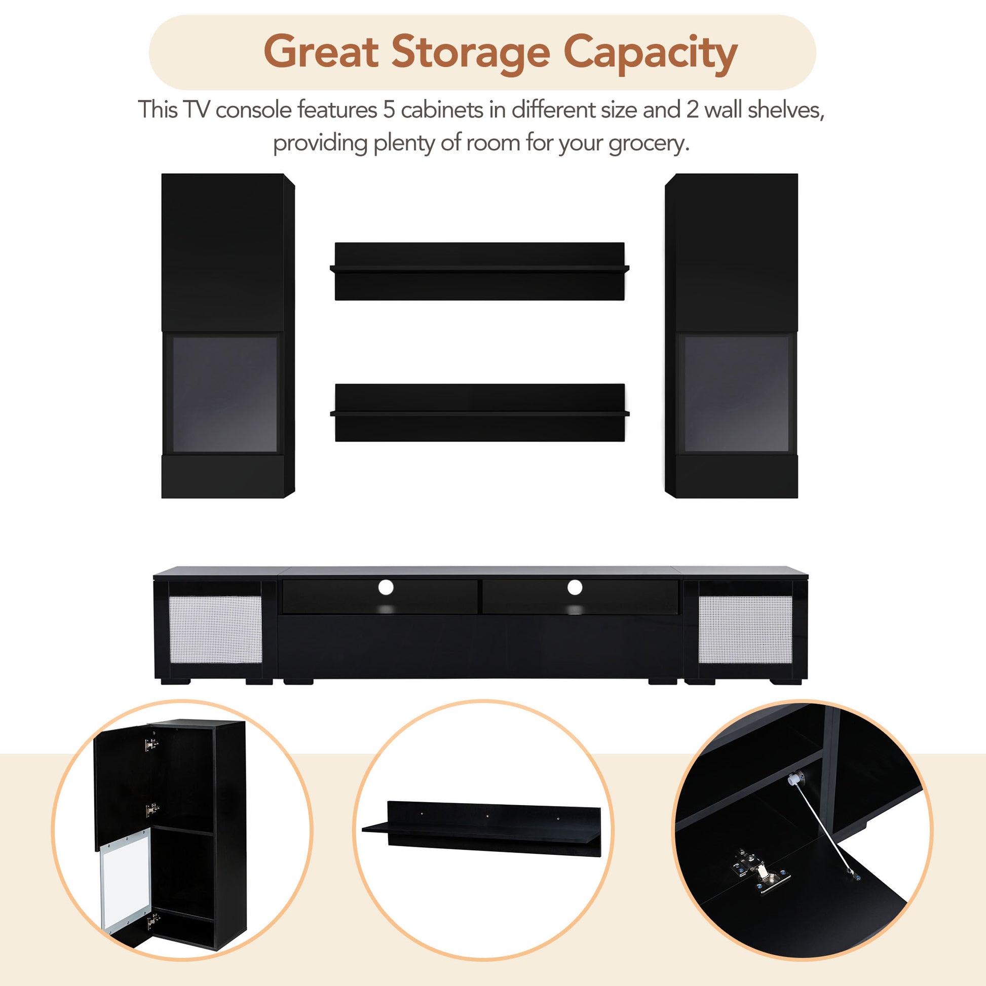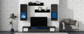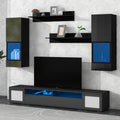 Extended, Rattan Style Entertainment Center, 7 Pieces Floating Tv Console Table For Tvs Up To 90'', High Gloss Wall Mounted Tv Stand With Color Changing Led Lights For Home Theatre, Black. Black Particle Board