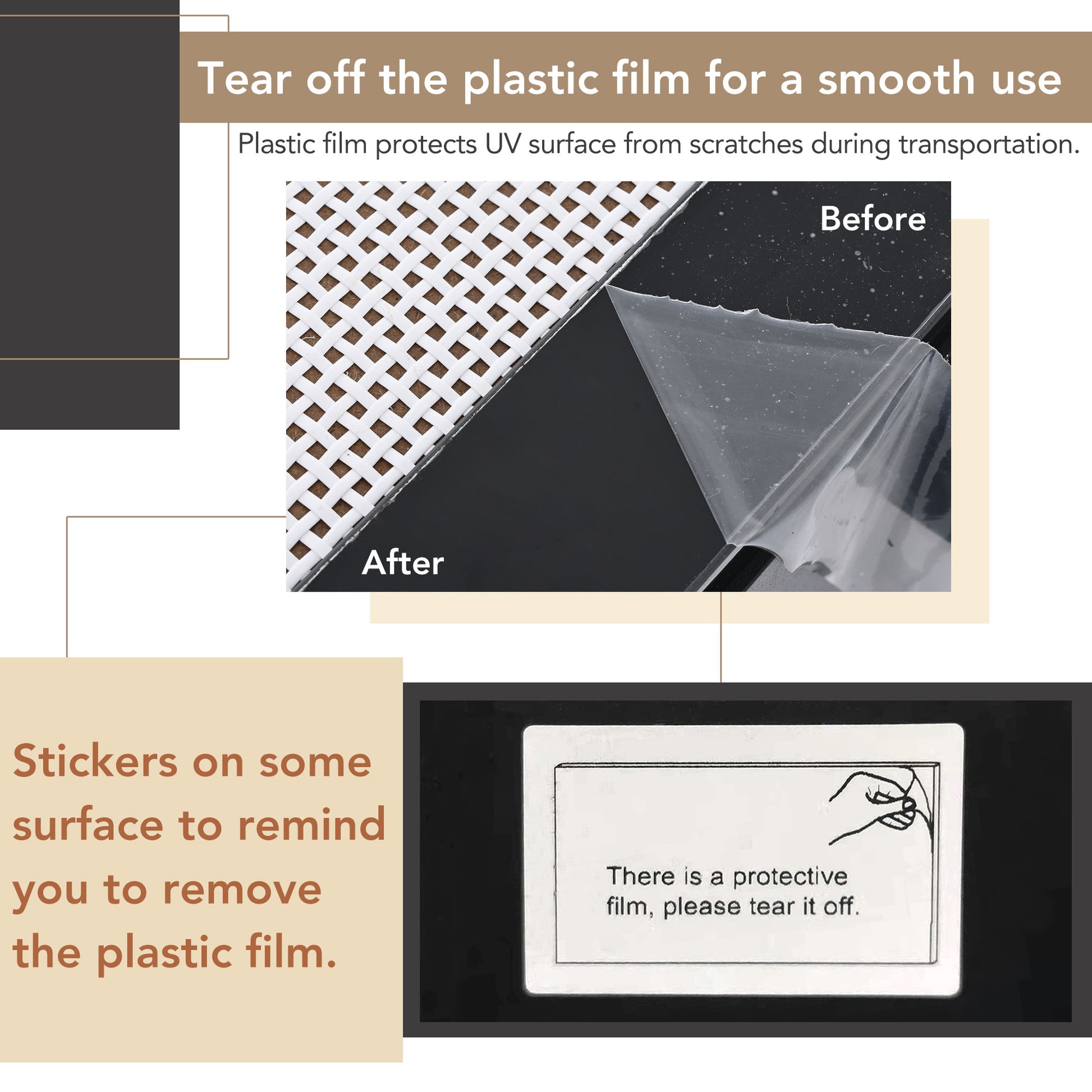 | Notice | The plastic film for protecting Uv from scratches should be teared off before put into use. If there is light dust on the edge, it can be wiped with a wet rag. |