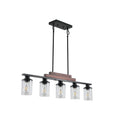 Farmhouse Industrial 5 Light Kitchen Island Pendant Light, Metal Wood Chandelier With Clear Glass Shades, Adjustable Height Hanging Fixture For Dining Room, Living Room, And Kitchen No Bulbs Walnut Black Glass,Iron
