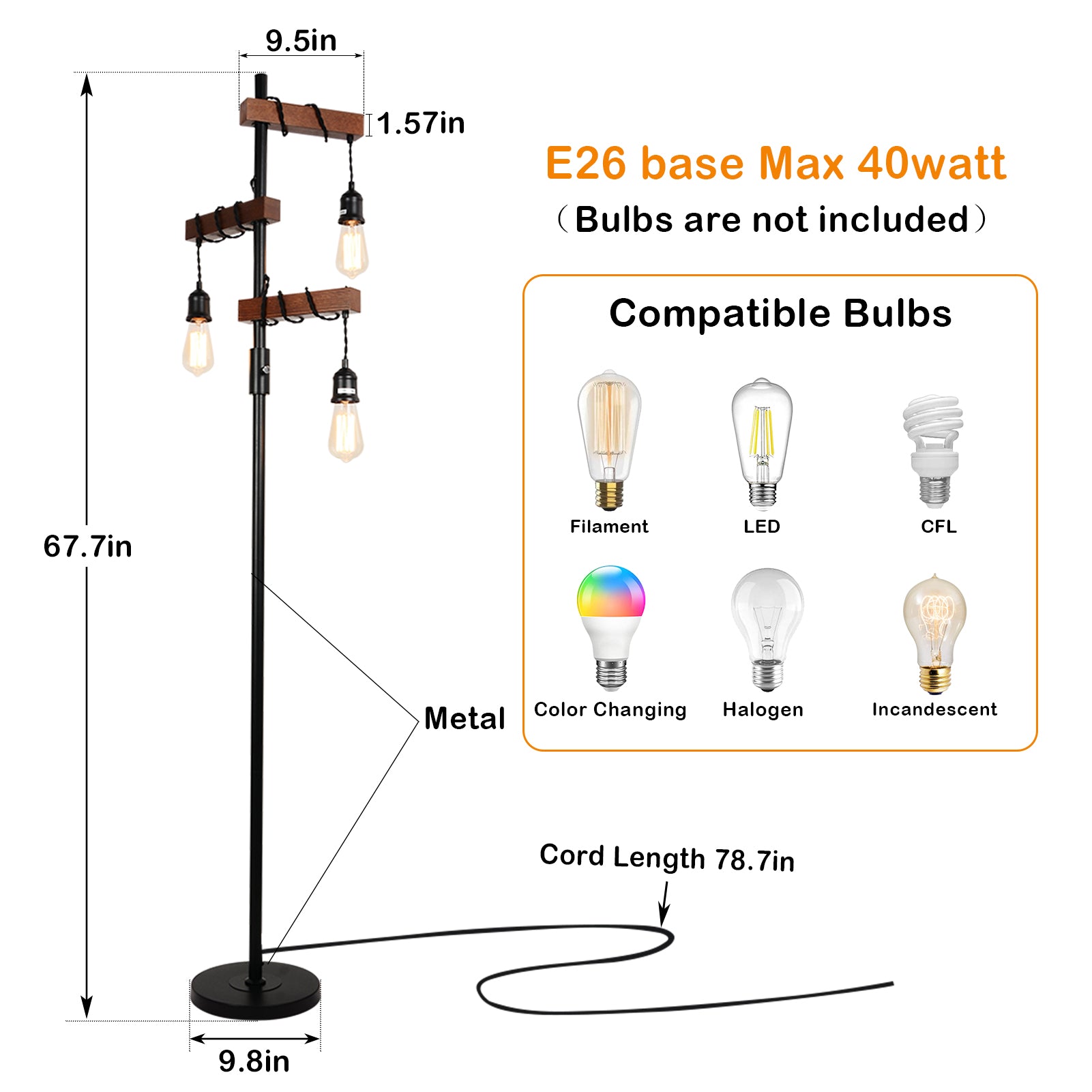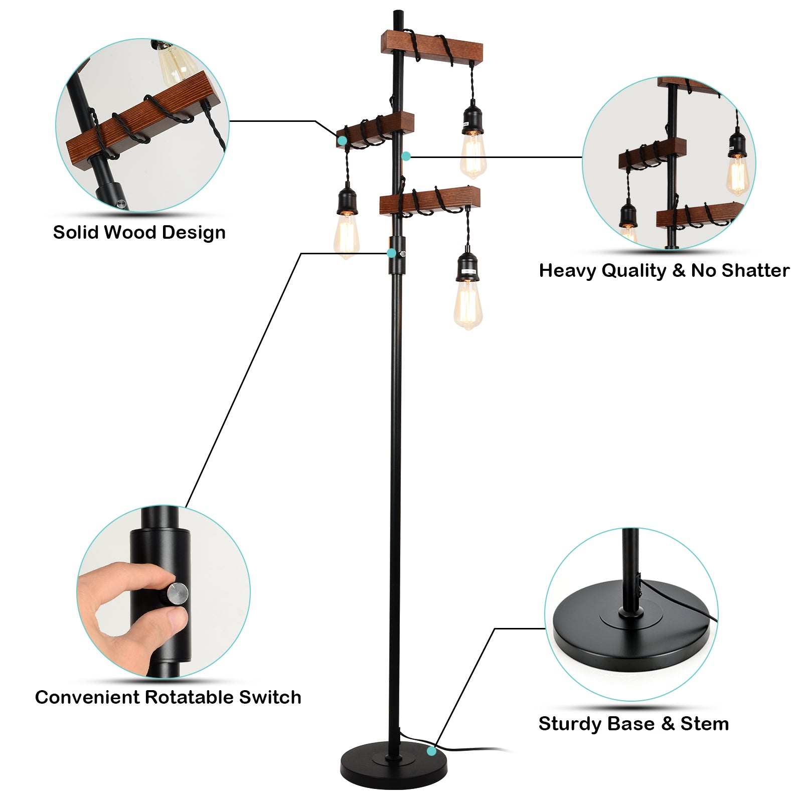 Farmhouse Tree Floor Lamp, 68 Inch 3 Lights Wood Standing Lamp Black Red Metal & Wood
