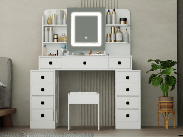 Farmhouse Vanity Desk With Sliding Mirror,Lights And Charging Station,Makeup Table Desk With Dimmable Led Light,Vanity Makeup Table With Sponge Soft Stool,White Brown Finish White Drawer 5 Drawers &