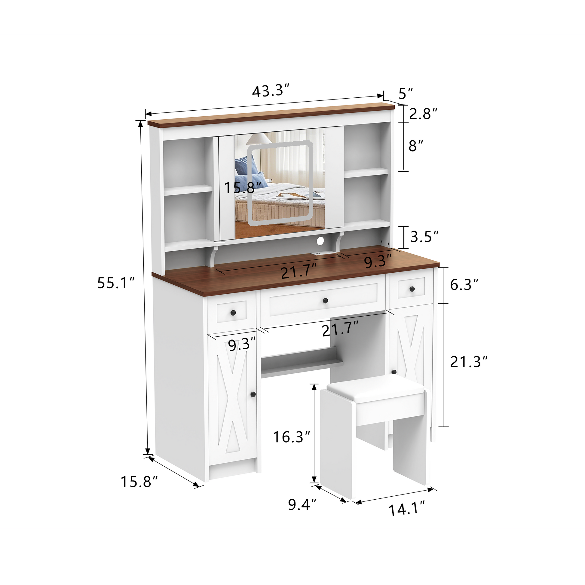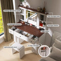Farmhouse Vanity Desk With Sliding Mirror,Lights And Charging Station,Makeup Table Desk With Dimmable Led Light,Vanity Makeup Table With Sponge Soft Stool,White Brown Finish White Drawer 5 Drawers &