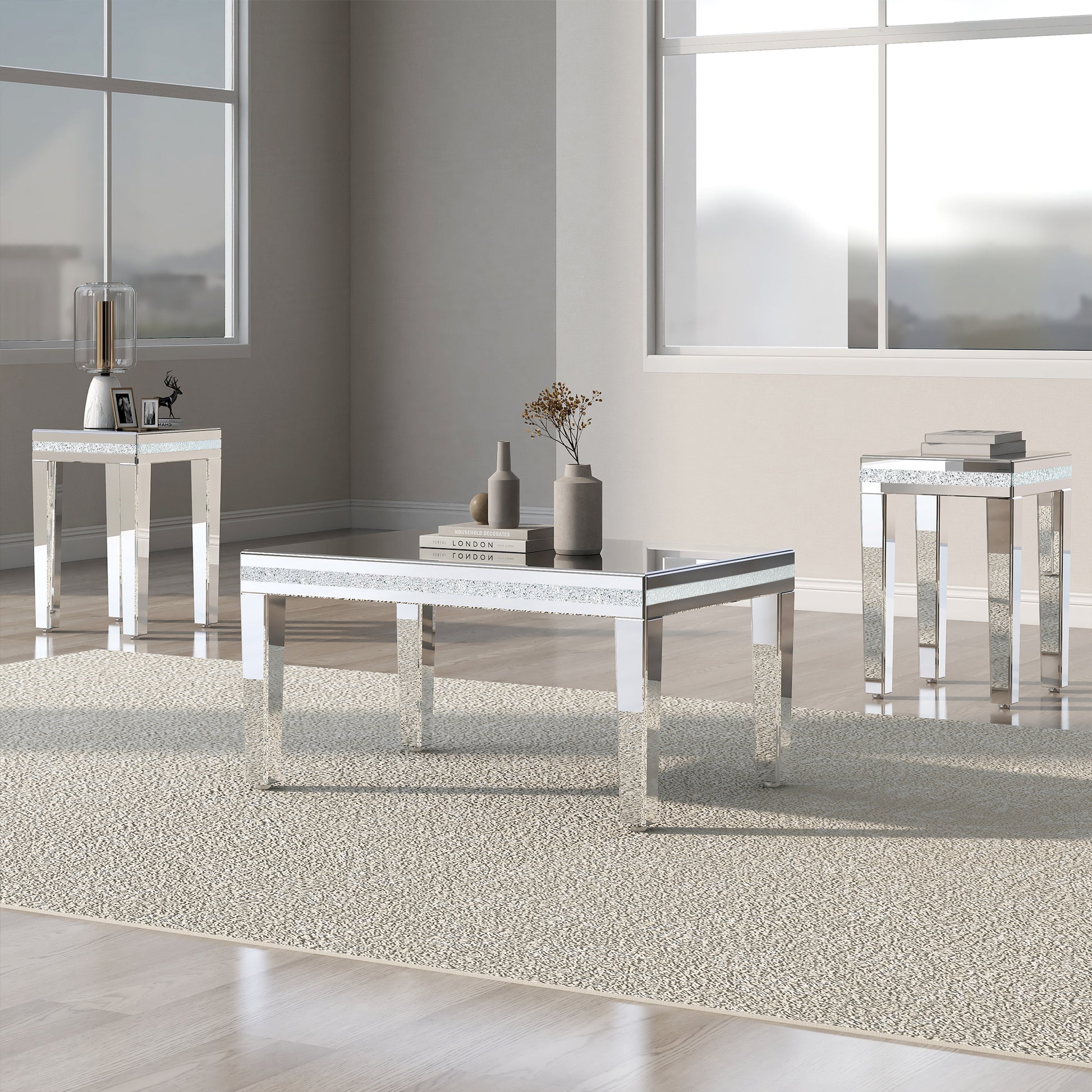 Fashionable Modern Glass Mirrored Coffee Table Set Of 3, Easy Assembly Crystal Design Cocktail Table With 2 End Tables For Apartment Home Office, Silver Silver Glass